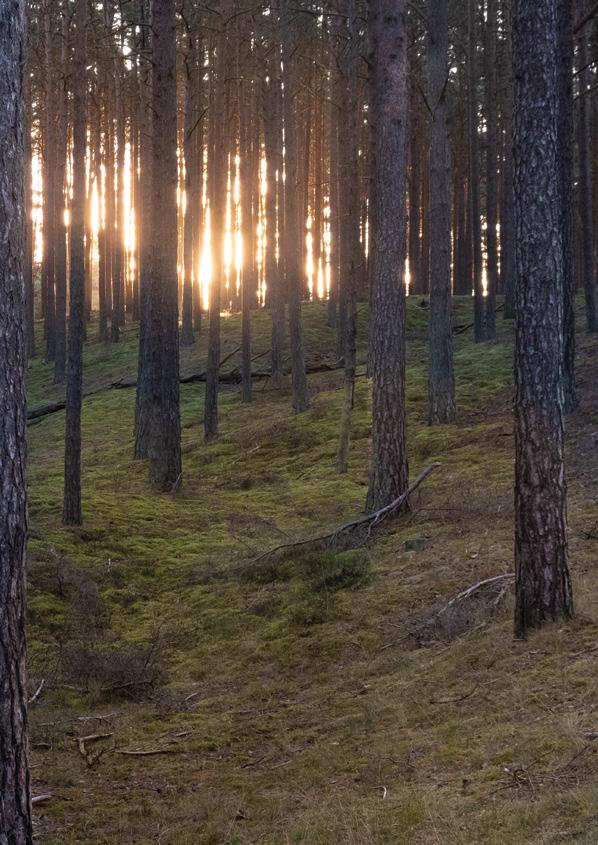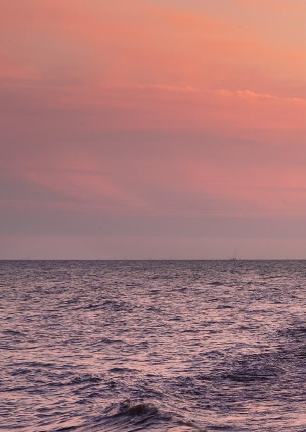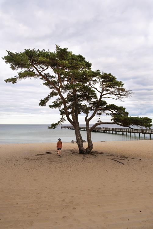 Am Abend ist es menschenleer. Das Meer hat den Großteil des Strandes abgekühlt, und nur ein Streifen aus Algen und Kieselsteinen trennt die Grasbüschel vom Wasser. Die Natur ist allein und die Vögel sitzen still auf den Felsen. Die Sonne ist nicht mehr zu sehen, aber das Wasser schimmert noch rosa. Weit draußen auf der Ostsee glänzen Fähren, auf ihrem Weg nach Deutschland oder Polen.