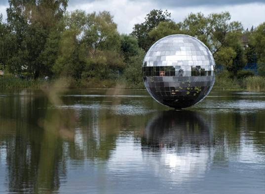 Die überdimensionierte Discokugel spiegelt die Natur wider und wird von Wind und Wasserkraft gedreht.