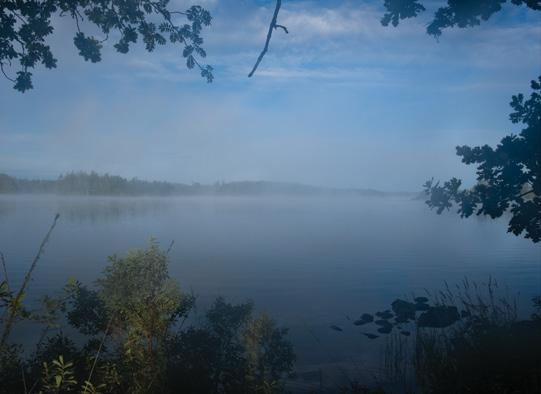 Auf Schotterstraßen und Radwegen führt der Sydostleden weiter nach Urshult. Ein paar Kilometer abseits übernachten wir bei Urshult Camping, direkt am See Åsnen, in einem Glampingzelt. Davor befindet sich ein Angelsteg, der am nächsten Morgen in Dunst gehüllt ist.