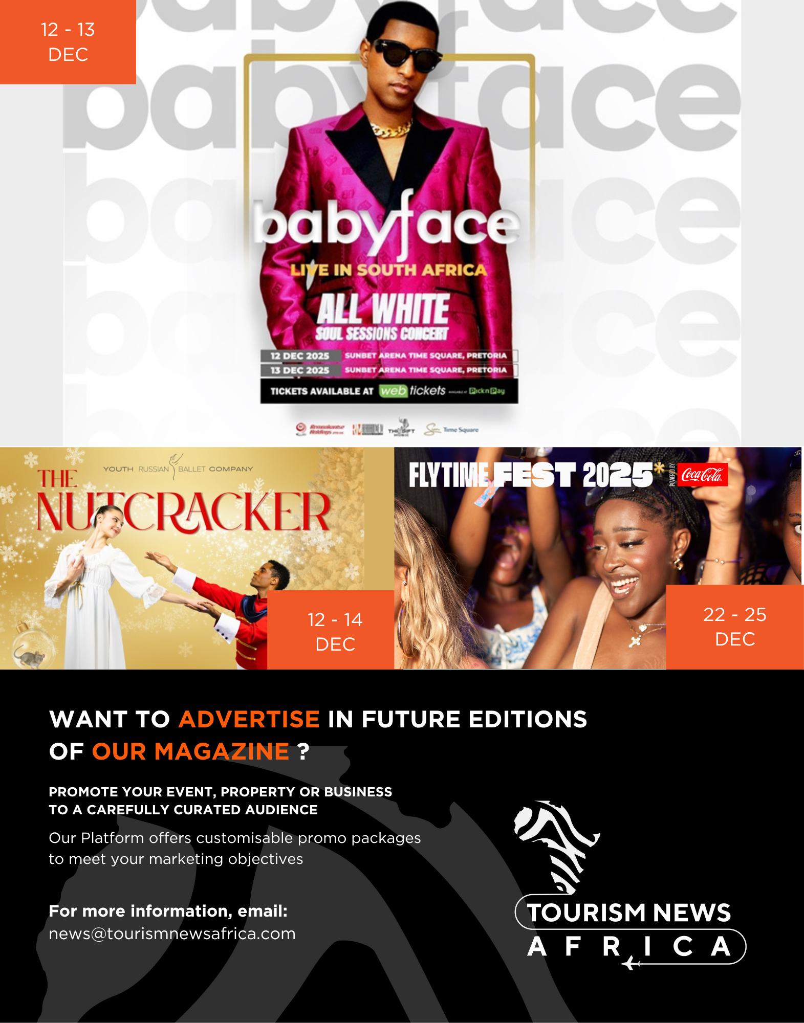 s 2025 draws to a close, we find ourselves reflecting on a year that unfolded like one of Africa’s epic migrations - full of unexpected turns, profound connections, and landscapes that have etched themselves on to our souls. For Tourism News Africa, this has been a season of immersion, not just observation. From dust-kissed game drives to saltsprayed shores, our journeys and stories have woven a tapestry celebrating our continent’s boundless allure. We’ve travelled and experienced so much culture, luxurious wildlife, and explored hidden gems, all while championing why Africa remains the ultimate call to those seeking wonder and adventure. Here’s a snapshot of what we have done and the tales we’ve told.