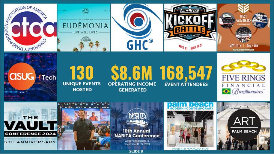 The Palm Beach County Convention Center continues to drive growth in group business, trade shows, and corporate meetings, while our thriving film and television sector welcomedover500productioncompaniesshowcasingthenaturalbeautyandversatility ofThePalmBeaches.