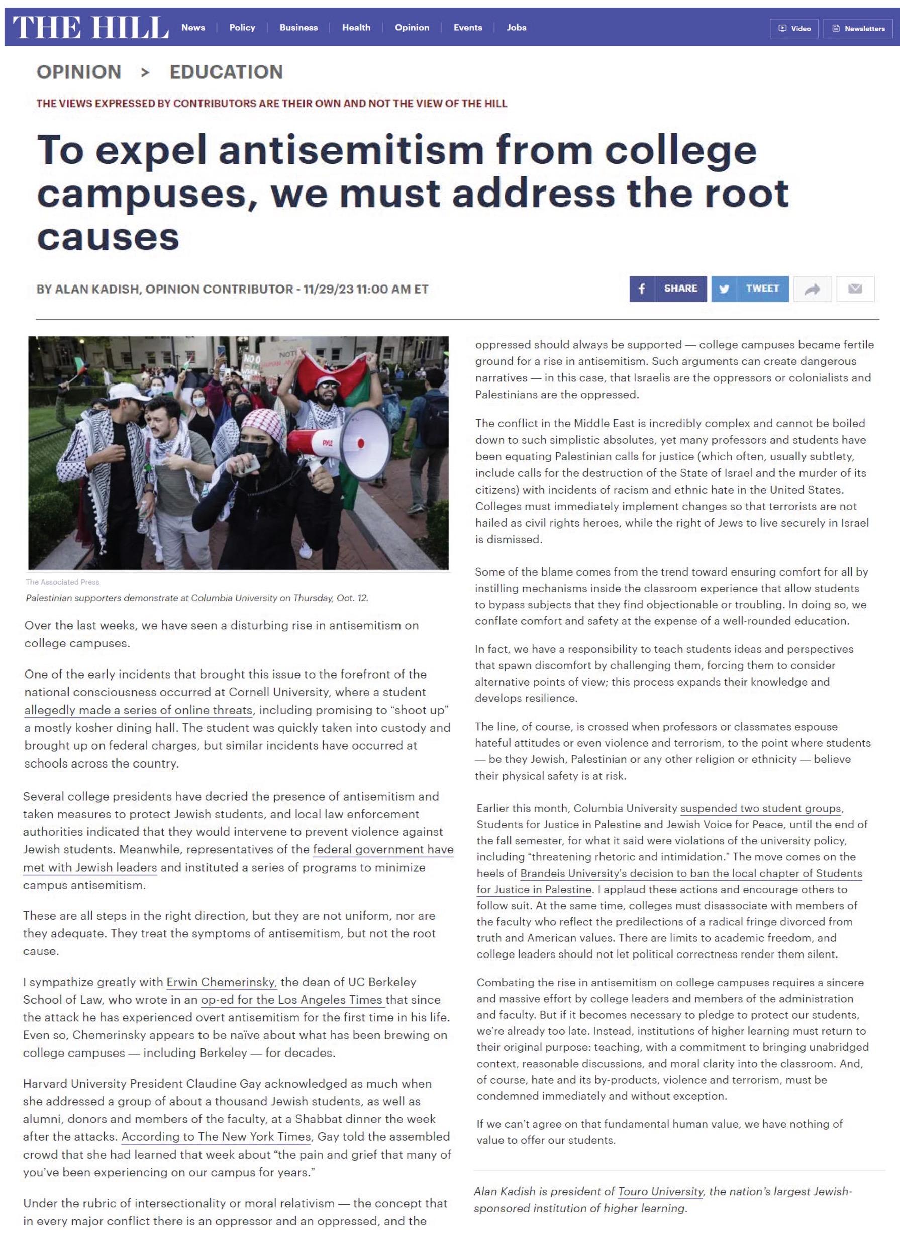 With US campuses roiled by Israel-Gaza war, Touro University President Dr. Alan Kadish opines on why college presidents must speak up for what’s right