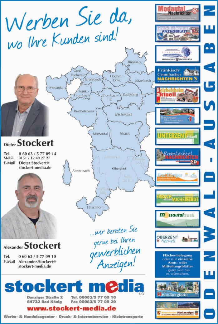 *Ihre Kleinanzeige erscheint in allen diesen Ausgaben: Bad König, Brensbach, Breuberg, Brombachtal, Erbach, FränkischCrumbach, Groß-Bieberau, Hirschhorn, Höchst, Lützelbach, Michelstadt, Mossautal, Modautal, Oberzent, Reichelsheim Gehen Sie gleich auf www.wittich.de/Objekt72388 und geben Sie diese dort online auf. Oder füllen Sie dieses Formular aus und schicken Sie es an uns.