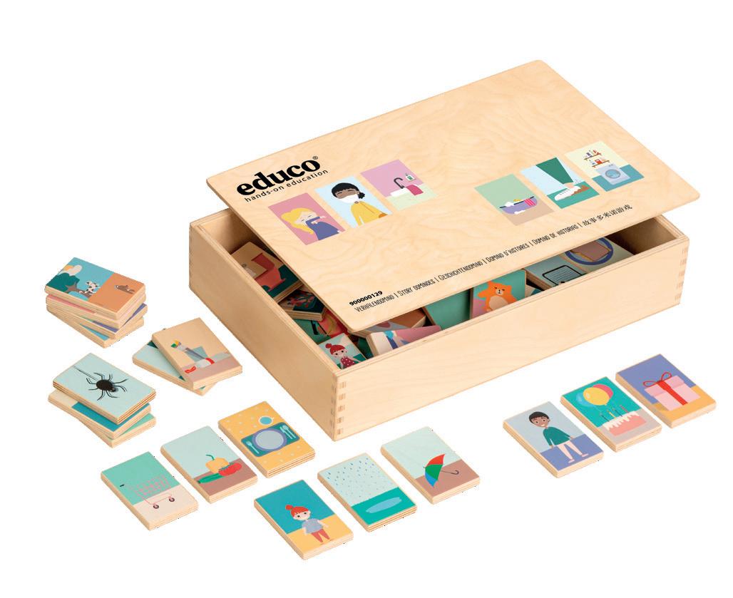 How long will your story be? Place the dominoes in an order you come up with on your own and discuss. Stimulates vocabulary and storytelling. Children practice basic words and place them in the right context. They learn to construct a story and to articulate correctly.