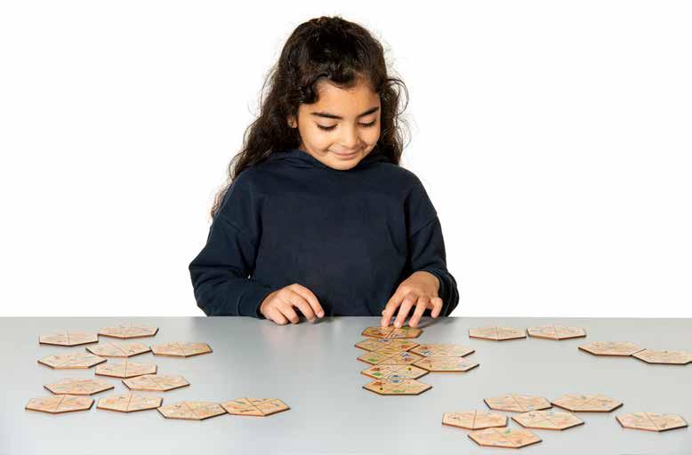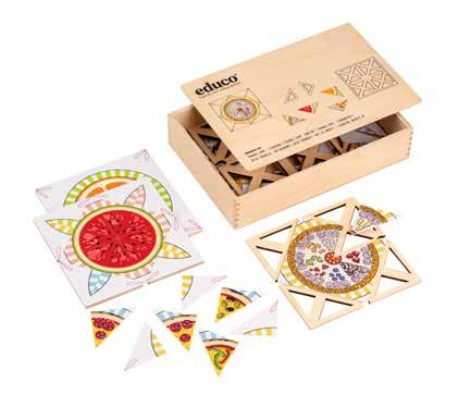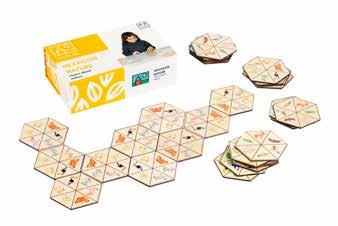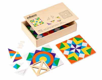 Create the geometric image by following an assignment card. For a challenging game, recreate one quarter of an image which is completed when reflected in the mirrors. 3Y+