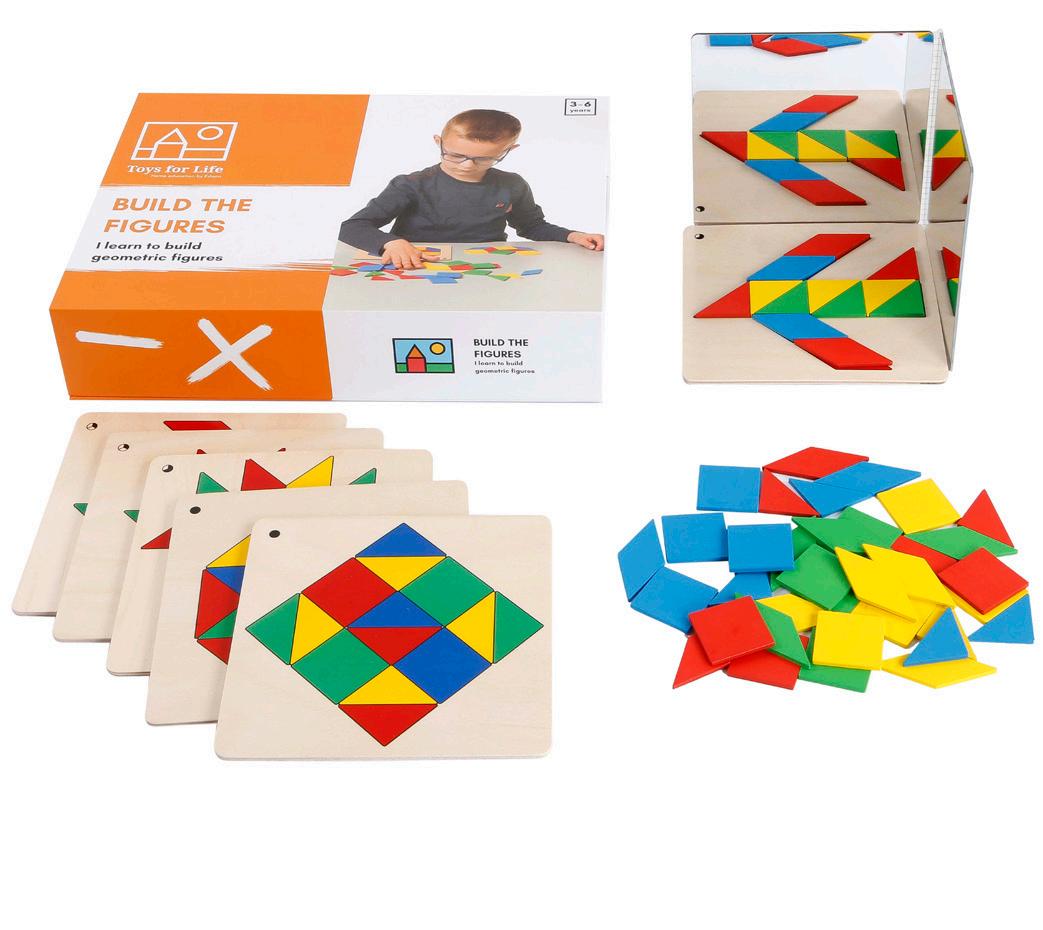 Create the geometric image by following an assignment card. For a challenging game, recreate one quarter of an image which is completed when reflected in the mirrors. Shape, pattern and spatial relationships take a new perspective. 3Y+