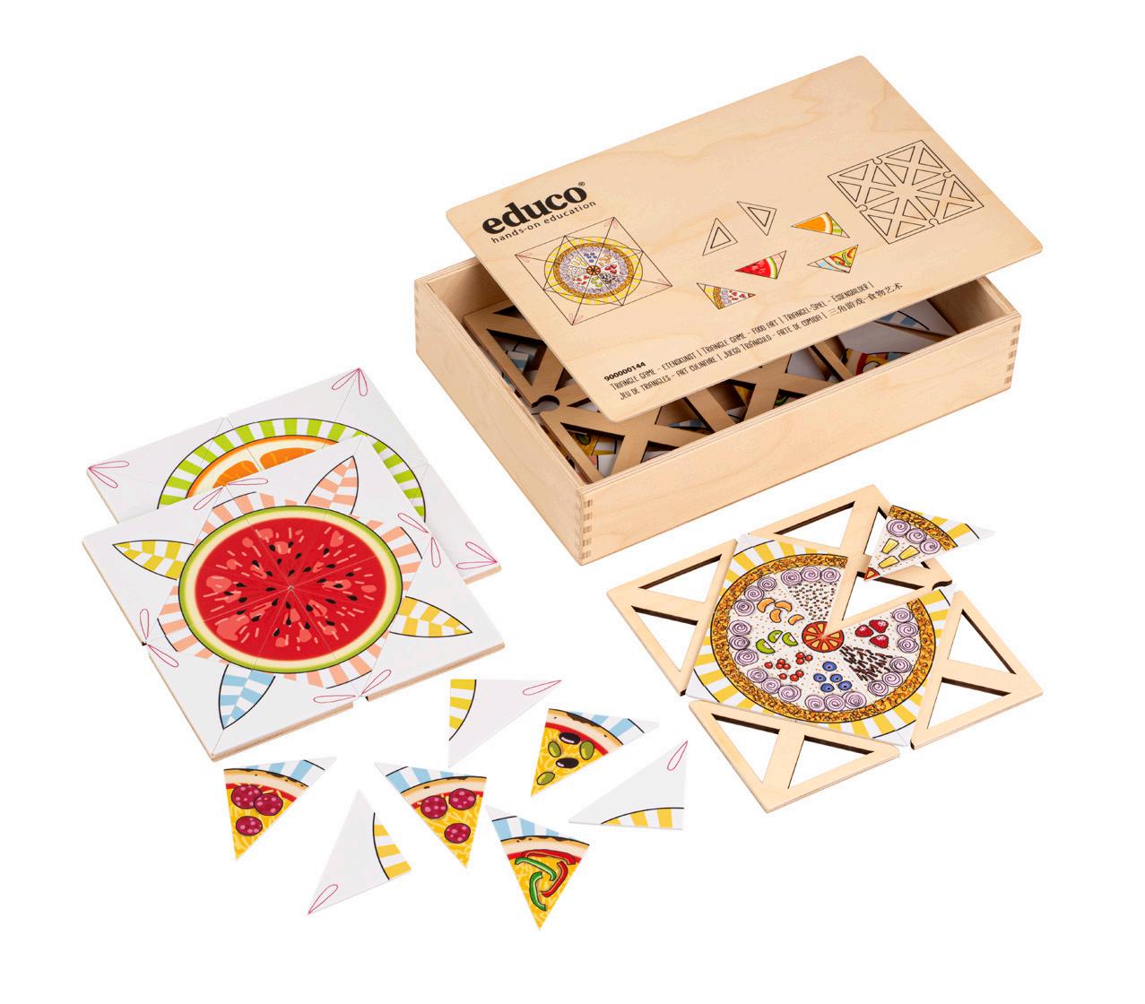 This material allows children to learn about combining shapes and colors to create their own works of art. This stimulates sense of shapes, colors, patterns, and symmetry. This also exercises the child’s fine motor skills. Includes 4 wooden work boards, 64 plastic triangles, 4 fixing elements and a wooden storage box. 3Y+