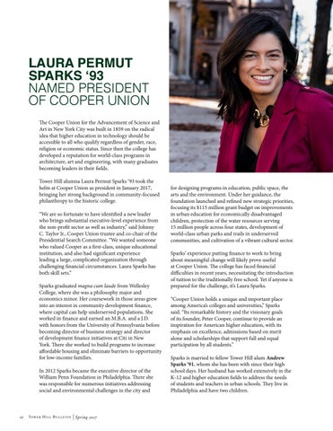 LAURA PERMUT SPARKS ‘93 NAMED PRESIDENT OF COOPER UNION The Cooper Union for the Advancement of Science and Art in New York City was built in 1859 on the radical idea that higher education in technology should be accessible to all who qualify regardless of gender, race, religion or economic status. Since then the college has developed a reputation for world-class programs in architecture, art and engineering, with many graduates becoming leaders in their fields. Tower Hill alumna Laura Permut Sparks ‘93 took the helm at Cooper Union as president in January 2017, bringing her strong background in community-focused philanthropy to the historic college. “We are so fortunate to have identified a new leader who brings substantial executive-level experience from the non-profit sector as well as industry,” said Johnny C. Taylor Jr., Cooper Union trustee and co-chair of the Presidential Search Committee. “We wanted someone who valued Cooper as a first-class, unique educational institution, and also had significant experience leading a large, complicated organization through challenging financial circumstances. Laura Sparks has both skill sets.” Sparks graduated magna cum laude from Wellesley College, where she was a philosophy major and economics minor. Her coursework in those areas grew into an interest in community development finance, where capital can help underserved populations. She worked in finance and earned an M.B.A. and a J.D. with honors from the University of Pennsylvania before becoming director of business strategy and director of development finance initiatives at Citi in New York. There she worked to build programs to increase affordable housing and eliminate barriers to opportunity for low-income families. In 2012 Sparks became the executive director of the William Penn Foundation in Philadelphia. There she was responsible for numerous initiatives addressing social and environmental challenges in the city and