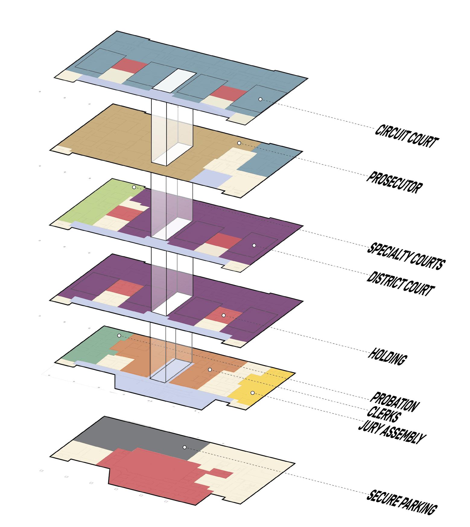 Elevated on a raised plinth, the structure limits the ability for vehicles to gain close access to any of the sides of the structure, mitigating active vehicle threats. The layout balances openness and restriction, enabling public engagement in transparent spaces while securing sensitive areas for judicial proceedings.