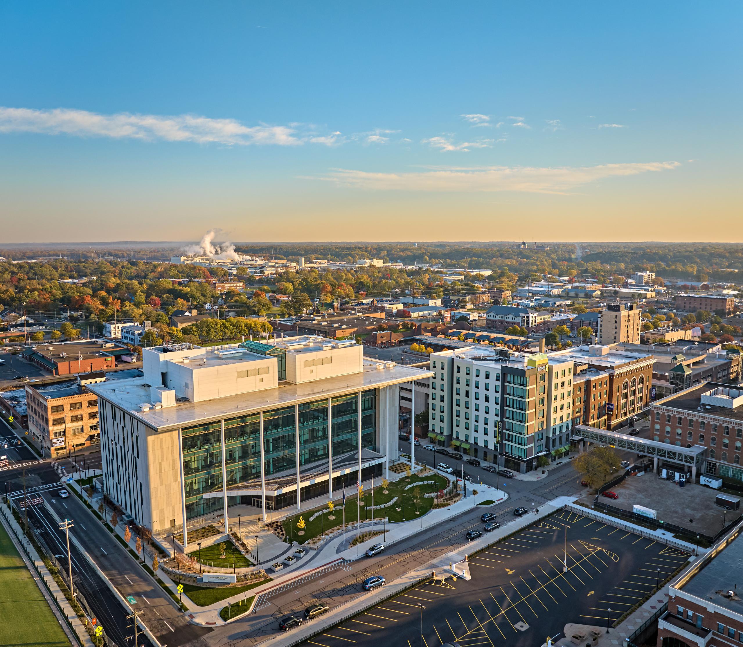 Kalamazoo County’s new Judge Charles A. Pratt Justice Center was designed to address critical shortcomings in the county’s outdated and dispersed justice system. Situated in the City of Kalamazoo’s downtown core, the facility anchors ongoing urban redevelopment efforts, linking civic life to the broader community. The layout prioritizes equitable access, transparency, and navigation. A prominent canopy marks the main entrance, offering a welcoming entry point while projecting civic importance.