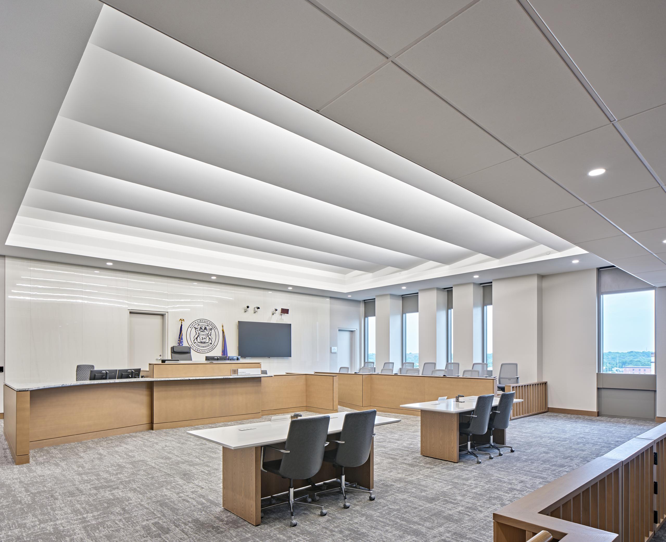Inside, the design balances significance and functionality, with features like a central light well channeling daylight into the clerk’s lobby and courtrooms. This integration of natural light fosters a sense of time and place, even during long proceedings, while intuitive pathways guide visitors seamlessly through the facility.