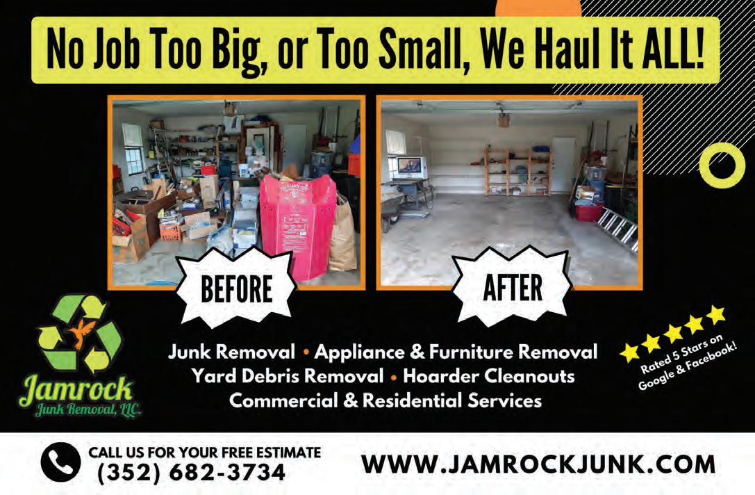 124 | OUR TOWN MAGAZINE SEPT/OCT 2023 • Wood rot repair • Drywall • Installation • Lighting • Door replacement • Pressure washing STRAIGHTFORWARD, HONEST, HANDYMAN AND HOME REPAIRS Whether you have a small “honey-do” list or are preparing your home for sale, we have the skills, experience, and know-how to get it done. Residential and Commercial properties. We’ll get it done. Right. 352-316-0192 www.strickservices.com SPECIAL ADVERTISING SECTION. CALL 352-372-5468 FOR RATES AND INFORMATION. LOCAL BUSINESS DIRECTORY • Tree trimming • Damaged and healthy tree removal • Stump removal & stump grinding • Land clearing • Debris removal • 24 hr. Emergency tree clearing • Storm Clean up Our tree service experts are fully licensed and insured to protect you and your property throughout each visit. (352)262-1791 Call today, Estimates are always FREE Licensed and Insured • Free Inspections Concrete, Crawlspace & Foundation Repair Michael Johnson Certified Field Inspector 904-862-8733 Tandcgutterservices.com t.cgutterservices@gmail.com Licensed and Insured Exemplary Standards. Extraordinary Services. Gutter Guards • Seamless Gutters • Cleaning Repairs NORTH FLORIDA’S MOST TRUSTED GUTTER SERVICES & TECHNICIANS 904-263-8248 (352) 377-1009 LIC#CFC043073 quality-plumbing.com