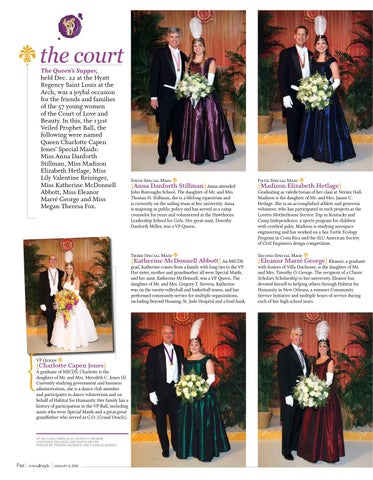 s the court The Queen’s Supper, held Dec. 22 at the Hyatt Regency Saint Louis at the Arch, was a joyful occasion for the friends and families of the 57 young women of the Court of Love and Beauty. In this, the 131st Veiled Prophet Ball, the following were named Queen Charlotte Capen Jones’ Special Maids: Miss Anna Danforth Stillman, Miss Madison Elizabeth Hetlage, Miss Lily Valentine Reisinger, Miss Katherine McDonnell Abbott, Miss Eleanor Marré George and Miss Megan Theresa Fox.