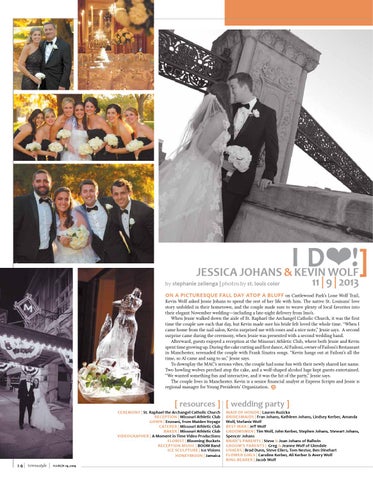 ON A PICTURESQUE FALL DAY ATOP A BLUFF on Castlewood Park’s Lone Wolf Trail, Kevin Wolf asked Jessie Johans to spend the rest of her life with him. The native St. Louisans’ love story unfolded in their hometown, and the couple made sure to weave plenty of local favorites into their elegant November wedding—including a late-night delivery from Imo’s. When Jessie walked down the aisle of St. Raphael the Archangel Catholic Church, it was the first time the couple saw each that day, but Kevin made sure his bride felt loved the whole time. “When I came home from the nail salon, Kevin surprised me with roses and a nice note,” Jessie says. A second surprise came during the ceremony, when Jessie was presented with a second wedding band. Afterward, guests enjoyed a reception at the Missouri Athletic Club, where both Jessie and Kevin spent time growing up. During the cake cutting and first dance, Al Failoni, owner of Failoni’s Restaurant in Manchester, serenaded the couple with Frank Sinatra songs. “Kevin hangs out at Failoni’s all the time, so Al came and sang to us,” Jessie says. To downplay the MAC’s serious vibes, the couple had some fun with their newly shared last name. Two howling wolves perched atop the cake, and a wolf-shaped alcohol luge kept guests entertained. “We wanted something fun and interactive, and it was the hit of the party,” Jessie says. The couple lives in Manchester. Kevin is a senior financial analyst at Express Scripts and Jessie is regional manager for Young Presidents’ Organization.