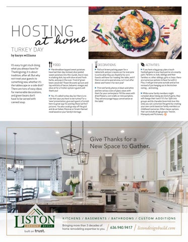 ACTIVITIES ▶ If you have a big group, plan a touch football game in your backyard or at a nearby park. Parents vs. kids, siblings and their families vs. other siblings, girls vs. boys: there are numerous options to have fun with it. Plus, it will get everyone outside and active instead of just hanging out in the kitchen eating ... and eating. ▶ While some family members might complain about doing any kind of game, they will change their tune if it’s fun. Split into groups and do charades (even kids love this one); you can customize the game by creating your own cards based on family members or childhood memories. Other classic options that can include all age groups: Twister, Monopoly and Pictionary.