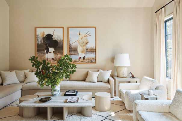 Upon entering the interior of the home, visitors are greeted with calming creams, beiges, tans and sands, all of which give the space a cohesive and refined feel. This subdued color palette, met with a circular motif seen in select pieces such as the curved mirror on the left and lantern light on the right, add to an overall theme of softness throughout the project. Photos take center stage as a unifying force in this remarkable project. Every piece is carefully selected to complement and enhance its designated space, resulting in a stunningly cohesive display of artistry in multiple mediums.