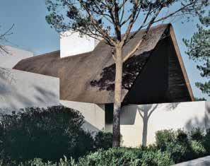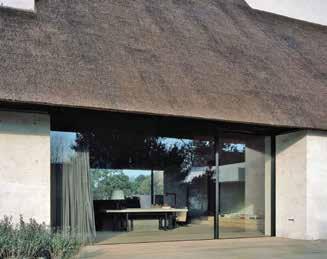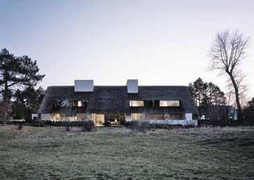 “Large, whitewashed brick volumes—positioned simply within the natural green landscape—support a large thatched roof. These primary architectural elements define the strong and modern character and expression of the house, which is an interpretation of the archetypal traditional villa in Knokke.”