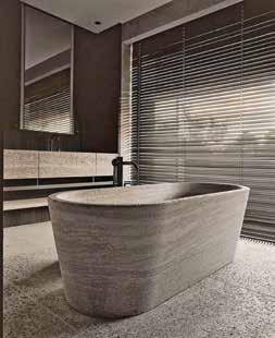 space, and this free-standing bathtub with floor-mounted faucet serves as a strong focal point for the bathroom. Early morning sunlight peaks through a wall of blinds, creating a truly serene place to unwind.