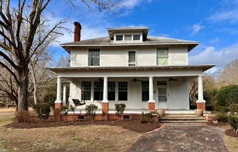 Experience the ideal combination of Southern charm and contemporary comfort in this exquisite 4-bedroom, 2-bath farmhouse. Set on over 13 acres of tranquil land, this residence serves as a welcoming retreat, o!ering ample room for family gatherings and entertaining friends. Whether you seek relaxation or wish to create cherished memories, this home is ready to embrace you. As you approach via the circular driveway and stroll along the beautiful brick walkway, you will be greeted by a charming front porch—perfect for sipping sweet tea while watching the children play or catching up with friends. Upon entering, the foyer establishes a tone of classic elegance, featuring cathedral ceilings, a stunning wooden staircase, and original hardwood oors. The living room boasts co!ered ceilings, freshly painted walls, and a striking brick replace, creating a warm and inviting atmosphere. Original pocket doors lead into the dining room, which also features a brick replace and grants access to a serene side porch with a screened door, overlooking a ourishing fenced garden lled with fresh berries and fruit trees. Newly planted pear, plum, and apple trees enhance the property, promising enjoyment for years to come. The master suite, conveniently located on the main oor, showcases lovely bay windows, a spacious walk-in closet, and a bathroom suite featuring an original clawfoot tub and a generous vanity sink. The kitchen o!ers ample space, complemented by extra storage in the laundry room, along with a practical mudroom at the rear exit for your convenience. Upstairs, you will discover two guest rooms sharing a Jack-and-Jill bathroom, complete with double sinks and a tub/shower combination. Additionally, a third bedroom can serve as an o$ce or study, while a large family room with its own replace o!ers versatility, potentially functioning as a fth bedroom. This farmhouse is brimming with potential and provides plenty of space to explore, grow, and make it uniquely yours. Begin your new adventure today by scheduling your private tour! $449,000