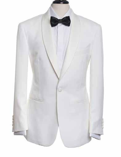 When deciding to go with a classic white tuxedo look, there are two options: the white with a black shawl lapel or the traditional white dinner jacket look. The dinner jacket means the lapel is made from the same material as the body of the garment, and typically has a shawl lapel. We love to pair either of these looks with black pants, and a black bow tie. This look is always a