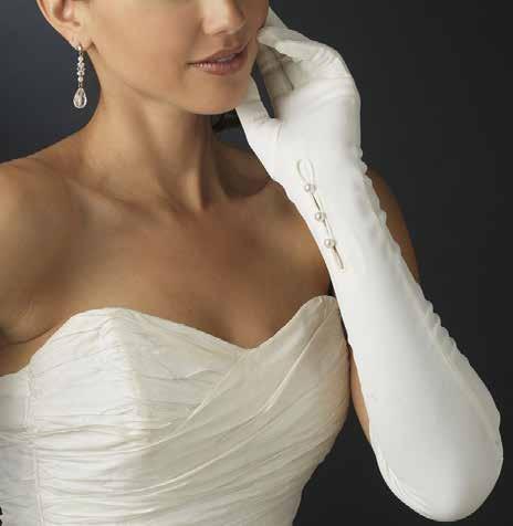 A long glove, either elbow- or opera-length, lends itself to a slim, bare dress. For a less formal look, per haps for an outdoor summer wed ding, shorties or classic-length gloves can be worn.
