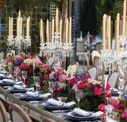 “To start, I would create a dramatic reception entryway with lush florals climbing up from the ground to the top of the entrance. Lavender and yellow are popular colors now, as well as peaches, corals, and pinks. For romantic gardenesque tables, I would choose lots and lots of garden roses, accompanied by peonies, lisianthus, French tulips, and lilac in compote centerpieces tucked among a tablescape of greenery and lush florals, maybe garlands that drop off the tables. Tall tapers would add light and drama.