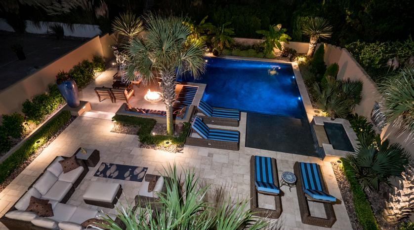 • Pristine Saltwater Gunite Pool with shallow entry Sundeck, Elegant waterfall & dynamic lighting features. Ocean Blue Pebble Tech Finish, Natural Gas Heater & Commercial Grade Filter System.