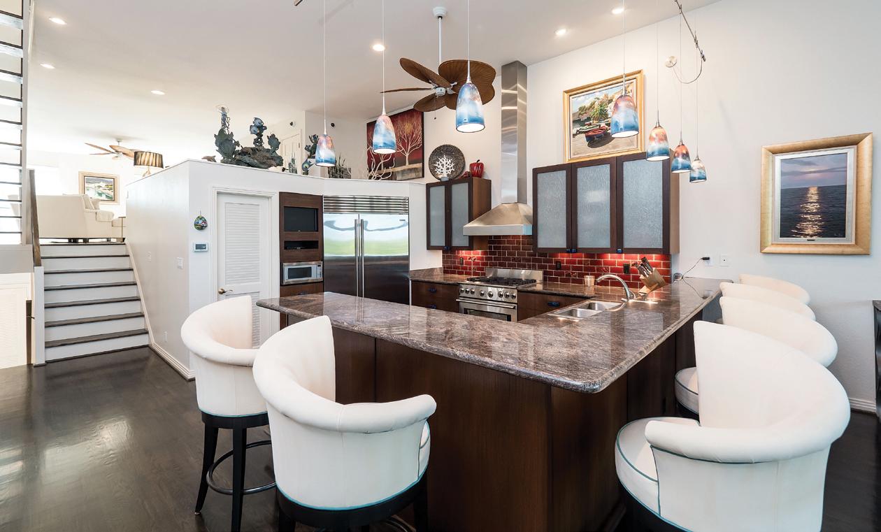 • Lux Kitchen with magnificent ocean views and custom cabinetry, Exotic Granite-tops & wrap-around bar with seating for 6 people. Features 6 custom upholstered Swaim bar chairs.