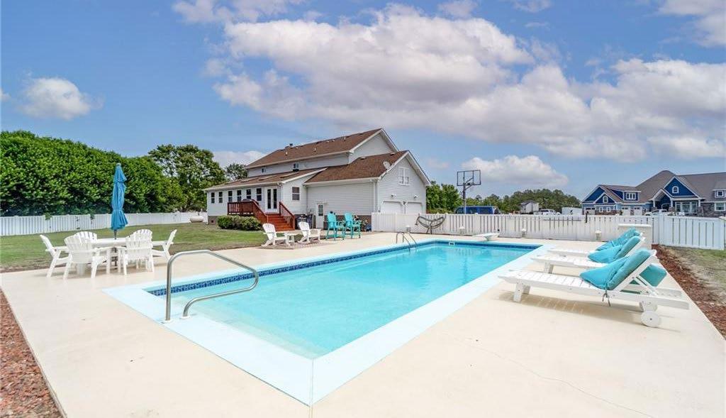 Perfect if you’re looking to live near the water & enjoy all the amenities of a waterfront community! This stunning home, boasting over 75’ of front porch that overlooks the breathtaking Currituck Sound. The open floor plan has tons of natural light w/beaming floors,& neutral paint. Kitchen is a chef’s dream! White cabinets, quartz countertops, ss appliances with Thermador gas cooktop, built in ice maker, subzero fridge. Huge island gives seating for guests that’s a central hub to cook & entertain. Apron farmhouse sink adds rustic charm while backsplash compliments the cabinets. First floor PBR that can be used as a In law Suite, along with a huge recreational room that has built-ins for additional living areas. Upstairs has an open loft. Large PBR on the second floor has two walk-in closets, & a soaking tub. Oversized frog for plenty of more room! In-ground saltwater pool 25k gal, sits on .69 acres, 12x10 shed. This house has loads of updates making it not just a home, but a fun experience.