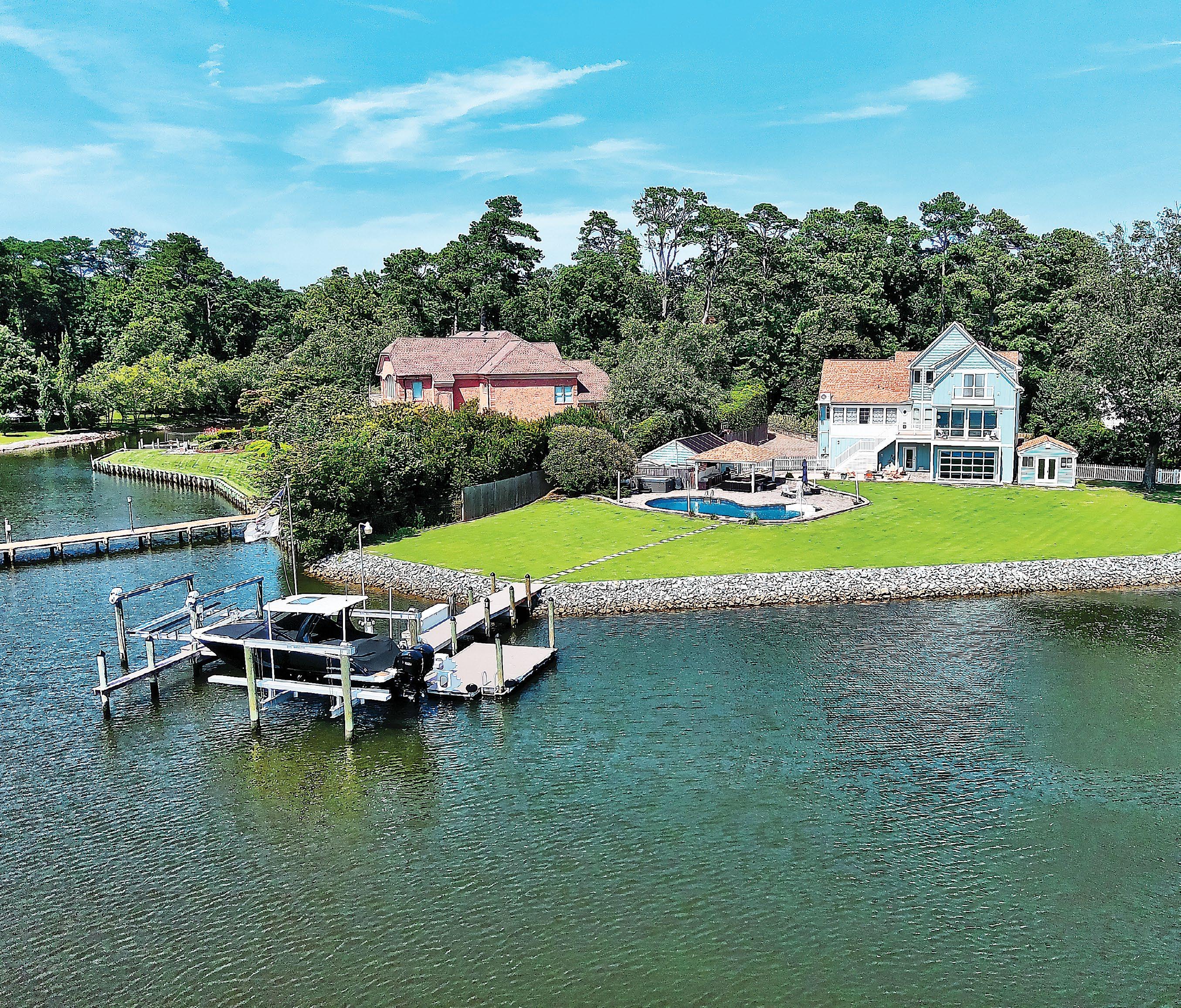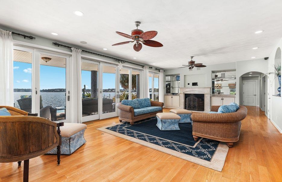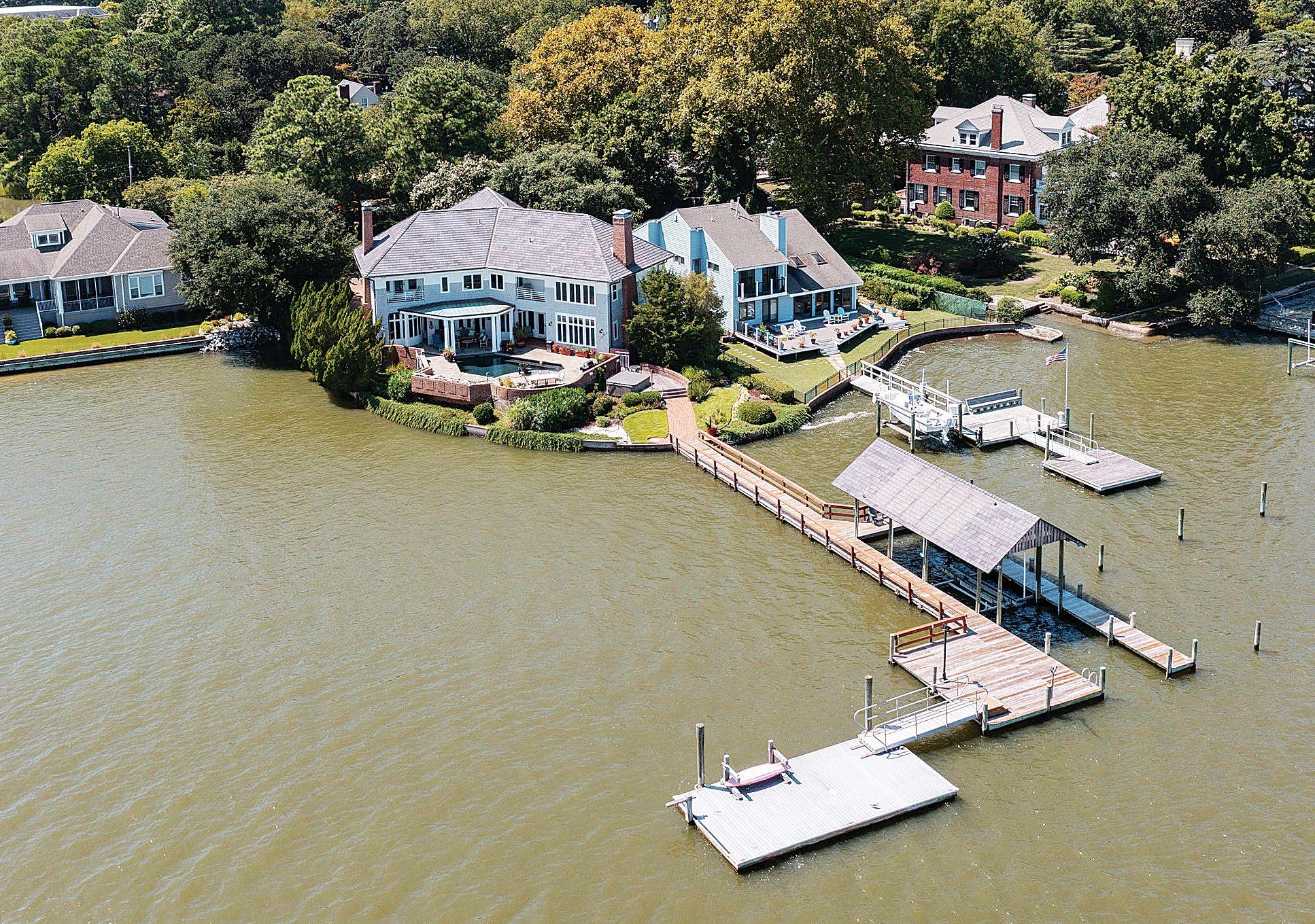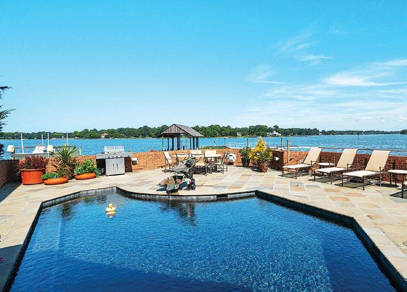 walk-in closets. In-law suite has living room, bedroom, tiled bath, steam shower, and washer/dryer. 50 year 180 mph composite roof 14, break proof windows, four zone HVAC and ductwork ‘20, Painted exterior ‘23, gas furnace ‘20. Whole house gas generator. 150 foot pier, 10K lb boatlift ‘24, composite floating dock, new hot tub. A three-car heated garage houses your prized vehicles. Outdoor space has Bluestone patio, Gunite pool.