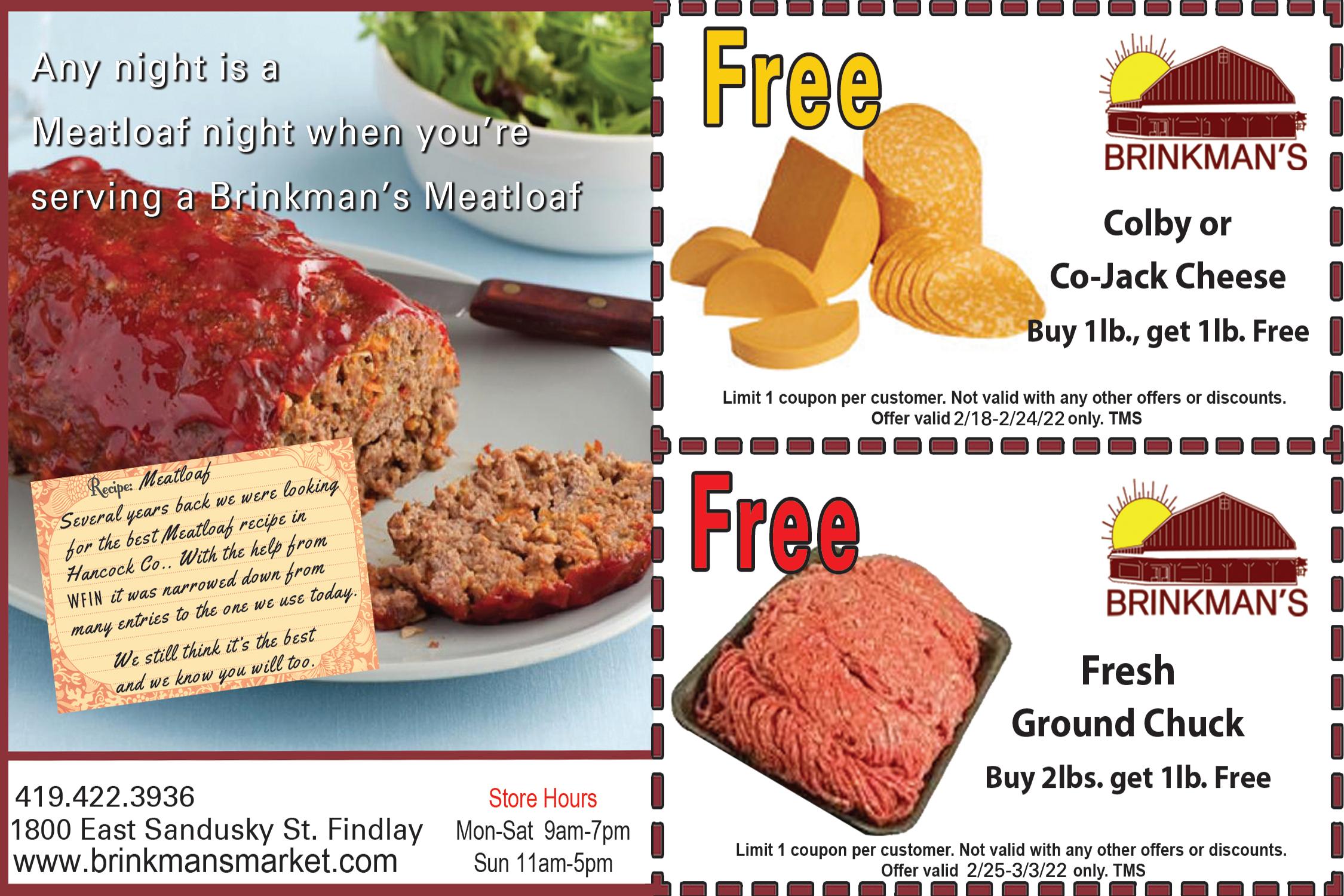 Chuck roasts 4- 1lb. Pks. bacon 3-1lb Sliced deli ham 2-1lb. Sliced deli turkey breast 2-1lb Sliced deli bologna 8-1lb Ground chuck ONLY $250.00 LG. FILL THE GRILL PACK 2-10oz. Ribeye Delmonico steaks 2-16oz. Sirloin steaks 2-12oz. T-bone steaks 2-10oz. Strip steaks 6-1lb Ground beef patties 3- 2¾lb Chickens quar tered 2 Full racks Baby Back Ribs 8-6oz. Pork loin chops 3-1lb Pkgs Brat wurst links 2-1lb Pkgs. hot dogs ONLY $220.00 All Your quality meat, cut FRESH daily! BEEF ECONOMY PACK 2-16oz. Chuck steaks 2-16oz. Shoulder steaks 2-28oz. Cubed round steaks 2-1½lb Sirloin tip steaks 1-2¾lb. London broil 3-1lb Chopped sirloin steaks 2-1lb. Cube steak ONLY $105.00 Stock your freezer now and enjoy great meats all winter long. Corner of St. Rt. 100 and US 224, South of Tiffin 419-447-1828