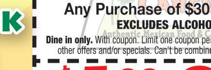 419-433-6017 CARRY OUT & CURBSIDE PICK-UP Family owned and operated 2109 CLEVELAND RD. HURON (Rye Beach Exit) H H H With coupon. One coupon per table. Excludes daily specials & other offers. Expires 10-14-21. With coupon. One coupon per table. Excludes daily specials & other offers. Expires 10-14-21. With coupon. One coupon per table. Excludes daily specials & other offers. Expires 10-14-21. SAVE $2.50 OFF LUNCH Buy 1 lunch at regular price, 2nd is $2.50 off $5.00 OFF Any purchase of $35 or more 419-433-6017 419-433-6017 costaazulhuron.com HAPPY HOUR Sun-Thurs 2-7pm Full Pitcher $15.99 Jumbo Margarita 20oz $6.25 12oz Margarita $4.25 * reg. lime only HOURS Sun-Thurs 11am-9:30pm Fri-Sat 11am-10:30pm SAVE $3.50 OFF DINNER Buy 1 at regular price from menu, 2nd is $3.50 off combo meal DAILY SPECIALS SUNDAY Family Fajita: $2.00 OFF any fajita dinner all day. TUESDAY Combination Platters: $9.99 THURSDAY Wings Choose from our unique wing sauces.
