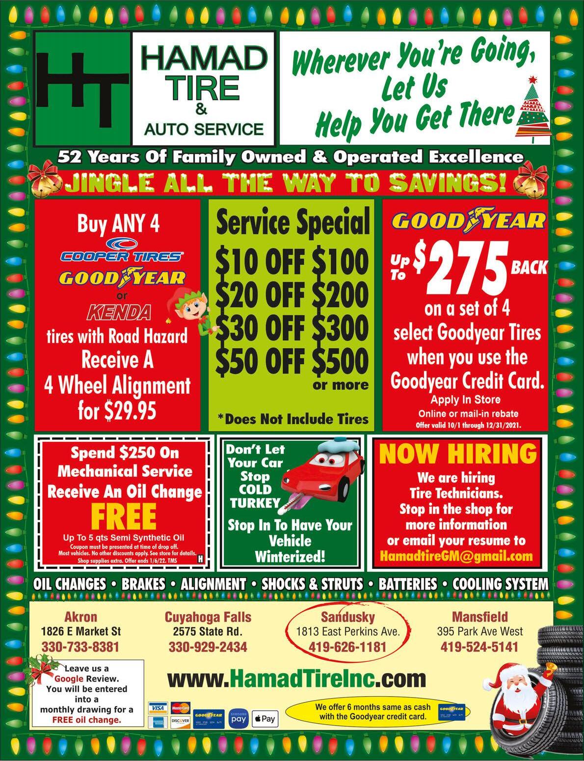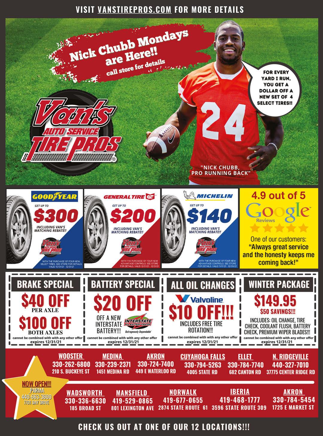 DENDINGER BROS. GIFT CERTIFICATES MAKE GREAT CHRISTMAS GIFTS! Multi-point inspection done on every oil change service! Having us change your oil WILL NOT and CAN NOT void your factory warranty! 1010 Castalia St. Bellevue, Ohio 419-483-5154 135 Monroe St. Bellevue, Ohio 419-483-9022 www.dendingerbros.com Locally family owned and operated since 1956 WE REPAIR ALL MAKES & MODELS — FOREIGN & DOMESTIC ★ TIRES ★ We price through 4 different warehouses to get you the BEST PRICE! Price will include installation. Synthetic Blend $29.95 Full Synthetic $49.95 Excludes diesels. Includes filter and up to 5 quarts of oil. Most cars and light trucks. Excludes diesels. Includes filter and up to 5 quarts of oil. Most cars and light trucks. 2 gals. coolant included. Extended life. Coolant System Flush-n-Fill starting at $89.95 Per axle. Installed. Most cars. Brakes, Pads, & Rotors starting at $249.95 Synthetic Blend with Tire Rotation & Brake Inspection $39.95 Excludes diesels. Includes filter and up to 5 quarts of oil. Most cars and light trucks. Full Synthetic with Tire Rotation & Brake Inspection $59.95 Excludes diesels. Includes filter and up to 5 quarts of oil. Most cars and light trucks.
