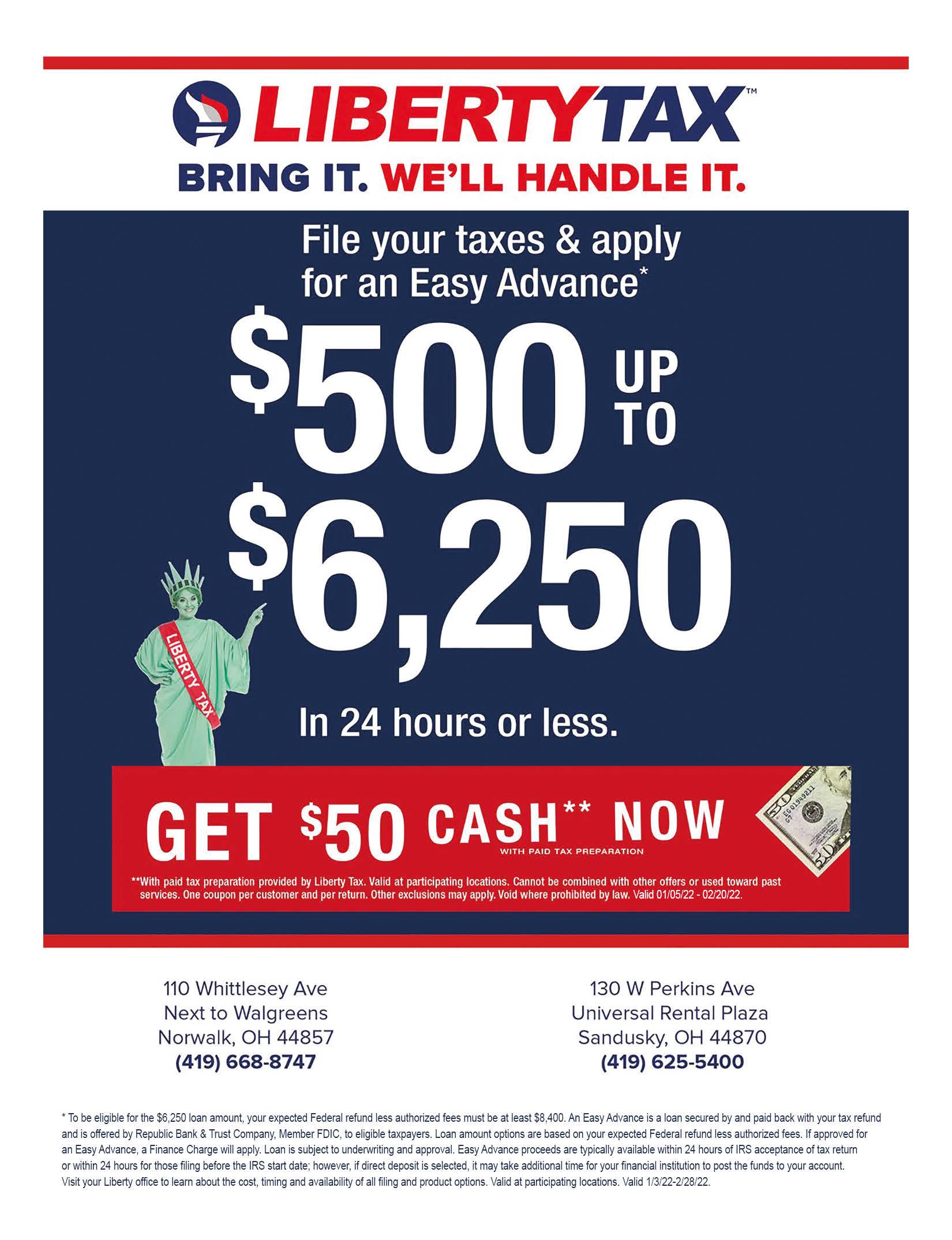 230 Milan Avenue • Norwalk, Ohio 567-743-9392 OPEN: Mon-Sat 11am-10pm • Sunday Noon-11pm Carryout or dine-in. With coupon. Cannot be combined with any other coupon or offer. One coupon per customer per visit. Expires 02-03-22. purchase of $30 or more only $6.99 Any Lunch Special SIDELINESSPORTSEATERY.COM N N Wayne K. Maslyk, Jr. Certi ed Financial Planner™ is is not cheap tax preparation. is is excellent quality tax preparation for less. Are you 60 or older? Do you usually owe income tax when you le? CPA PREPARED INCOME TAX PREPARATION $90 Includes: 1040 Short or Long Form, including Schedules A, C, F, E, L, and M if applicable; State; Local/RITA; and School District. Must have minimum liquid or investable net worth of $250,000. 1325 Hull Road • Sandusky 419-626-3900 1530 West River Road • Elyria 440-934-3141 Or call toll free: 1-866-626-3990