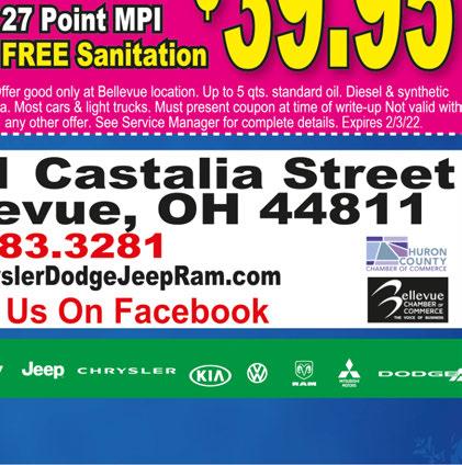 WHEN YOU MENTION THIS AD YOU’LL RECEIVE A 10% DISCOUNT OFF YOUR NEXT SERVICE — UP TO $50 OFF! 274 CLEVELAND RD. • NORWALK • WILLIAMSNORWALKTIRE.COM • 419-668-3071 TERMS AND CONDITIONS APPLY. DISCOUNT VALID UNTIL 01-31-22. Excludes tires, rotations, and oil changes. Please mention ad when scheduling or dropping off vehicle. ENGINES TRANSMISSION BRAKES MAINTENANCE TUNE-UP SUSPENSION BEARINGS Scan the QR code to buy tickets! 600 Southw t St. • Bellevue, Ohio 44811 thevuebanquetandeventcenter.com info@thevue419.com Grab Your Partner Square Dancing Saturday, February 5 6-10pm — Advance Ticket Sales Only — $21 per person Includes light appetizers Cash bar featuring The Sawbuck Band “Just Because” BBQ Bu et Fridays, February 18 & 25 5-8pm Adults (13 & older) $25 Kids