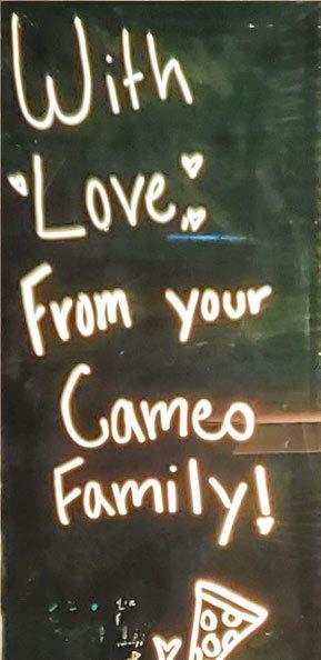 FAMILY PAK #1: 2 Lg. 2-topping pizzas & a small cheesybread $29.95 FAMILY PAK #2: Lg. 2-topping pizza, small Cheesybread, & breadsticks $19.99 SUPER PAK: 3 Lg. 1-topping pizzas & a medium Cheesybread $39.99 KIDS’ PAK: Lg. 1-topping pizza, cheese sticks, & Cinnabread $19.99 2 sm. 2-topping pizzas $14.95 Med. 2-topping pizza $9.99 Sub or Wrap 2 for $10.00 Lg. 2-topping pizza 6 boneless wings $17.95 Lg. 2-topping pizza $12.99 Med. specialty pizza $12.99 2 Lg. 2-topping pizzas $27.95 • • • SPECIALS • • • SANDUSKY 419-626-0187 HURON 419-433-0811 EXXON-MILAN 419-616-4444 WE’RE OPEN! We are doing the very best we can to ensure you have a SAFE family time at Cameo! ORDER ONLINE. IT’S TOO EASY! TRY OUR NEW CAMEO PICKLE BREAD! Thank You for your support! TopSide opening soon for parties!