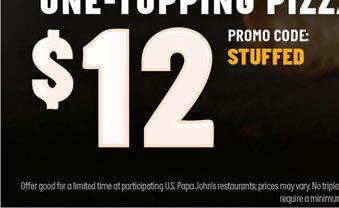 Sandusky 120 E. Perkins Ave. 419 609-9444 Not valid with other offers. Good at participating restaurants. Limited delivery area; charges may apply. Customer responsible for all applicable taxes. Expires 05-12-21. — Locally Owned & Operated — PAPAJOHNS.COM Now Hiring. Start Today! Order 1 Large Pizza— Build your own or any Specialty pizza—for just Sides or Desserts Not valid with other offers. Good at participating restaurants. Limited delivery area; charges may apply. Customer responsible for all applicable taxes. Expires 05-12-21. $600 Papa Rewards Points=12 Order on the “Specials” page at www.papajohns.com 2 Sides or Desserts for just Specialty Bundle Not valid with other offers. Good at participating restaurants. Limited delivery area; charges may apply. Customer responsible for all applicable taxes. Expires 05-12-21. $1999 Papa Rewards Points=19 Papa Rewards Points=12 PROMO CODE=LARGEANY12 Try our NEW eat-in tables and chairs in our lobby! Large Pizza Deal $1200 Get The Works or any Large Specialty Pizza, Breadsticks, & a 2-Liter Order on the “Specials” page at www.papajohns.com WE’RE MOVING! Come visit us at our NEW LOCATION: 710 WEST PERKINS AVENUE (The old Flowerama shop) Place an order for carry out and come say “hello,” or drive up to our convenient Pick Up window. Better ingredients, better pizza, better location to serve YOU, our fellow year-round residents! TEMPORARILY CLOSING MONDAY, MAY 3 REOPENING FOR THE WEEKEND OF MAY 8TH! EACH Choose from 10” Cheesesticks, Breadsticks, Garlic Parmesan Breadsticks, Garlic Knots, 6-pc. Wings, 10 pc. Poppers, Cookie, Brownie, or Cinnamon Pull-aparts