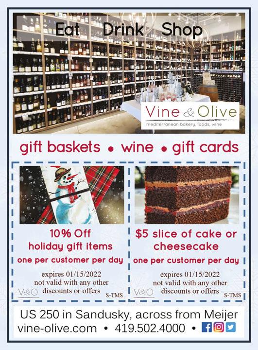 Open Sun-Thurs 10am-10pm Fri-Sat 10am-11pm WE DELIVER! with $8.00 or more food purchase. (Our emphasis is on safe driving. We do not guarantee delivery time.) We Do Not Accept Personal Checks Taste the Difference! We use only 100% Grande mozzarella & provolone cheeses. 419-626-0205 www.bestdarnpizza.com Tiffin Ave. • Sandusky 419-626-0205 With coupon. Not valid with other offers. Delivery extra. Expires 01-20-22. Tiffin Ave. • Sandusky 419-626-0205 With coupon. Not valid with other offers. Delivery extra. Expires 01-20-22. Tiffin Ave. • Sandusky 419-626-0205 With coupon. Not valid with other offers. Delivery extra. Expires 01-20-22. With coupon. Not valid with other offers. Delivery extra. Expires 01-20-22. Tiffin Ave. • Sandusky 419-626-0205 Tiffin Ave. • Sandusky 419-626-0205 Large Cheese Pizza $9.99 With coupon. Not valid with other offers. Delivery extra. Expires 01-20-22. NEW! Cauliflower Crust 12” 2-Item Pizza 2 14” 1-Item Pizzas $16.99 $21.99 Large 2-Item Pizza, Medium 1-Item Pizza, & a 2 Liter $10.99 $29.99 Large 2-Item Pizza, 10 Traditional Wings, Small Cheesy Bread w/ Sauce, & a 2 Liter N Washington St. Market St. HuronAve. Wayne St. Columbus Ave. Jackson St. DOWNTOWN SANDUSKY OPEN Mon-Fri 9-5pm Sat 9-2pm 419-366-4612 Text us at 419-706-2593 236 Wayne St. • Sandusky REFRESH • RELAX• RENEW • REJUVENATE T.H.E. REJUVENATION STATION MASSAGE CENTER www.thestation.massagetherapy.com • Follow us on Facebook Lynn Burch, LMT, 3rd Degree Reiki Master Rena Gaudin, LMT GIFT CERTIFICATES Make Great Stocking Stuffers! giftMassageisa Orderofhealth. yourgiftcertificatetoday! Call to request additional hours Massagesmake greatgiftsfor Christmas&other specialdays! NOW HIRING • Massage Therapist • Esthetician Can’t come in? Call us, and we’ll mail you your certificates! Therapeutic and Relaxation Massages Designed Just for you!