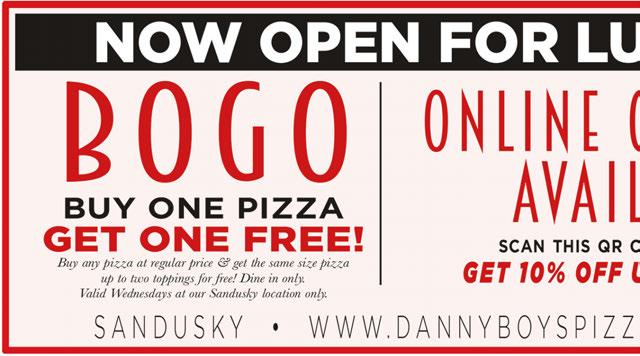 ITALIAN RESTAURANT A tradition of great food, family, friends, & Frank 6207 Milan Rd. Sandusky — Just North of Kalahari — 419-621-1000 DannyBoysPizza.com BOGO WEDNESDAYS! Buy 1 pizza, any size, get 1 FREE! OPEN Sunday-Thursday 11am-9pm Friday & Saturday 11am-10pm