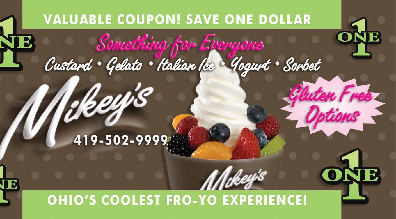 ® PERKINS AVE RT 2 RT 250 C O L U M B U S A V E C A M P B E L L S T R 101 RT 4 H ES AVE KROGER MIKEY’S NEW: Made-to-Order Cannolis! Cannolis! 419-502-9999 www.mikeysfroyo.com • 419-502-9999 414 W. Perkins Ave • Sandusky, Ohio Connect With Us to Receive Special Offers and Updates. HOURS: WED & THU 3-9pm FRI & SAT 3-10pm SUNDAY 1-9pm Like Us on Facebook mikeysfroyo Follow Us on Twitter @mikeysfroyo ® Call us about Fundraising opportunities! Vegan Friendly & Non-Dairy Options Order yours today! Coconut Milk • Custard • Gelato • Yogurt • Sorbets • Italian Ice Something for Everyone OUR FRUIT IS ALWAYS FRESH! Valid on purchase of $5.00 or more. Cannot be combined with other offers. No cash value.