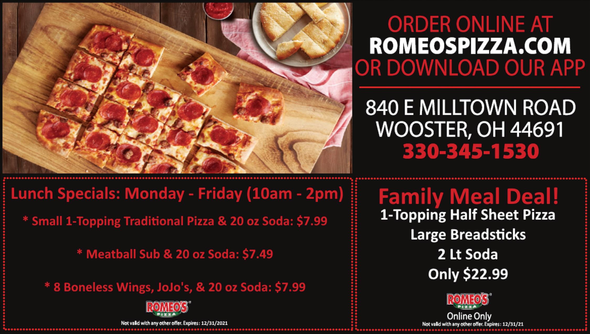 6150 S. Carr Road Apple Creek, OH 44606 (330) 698-0229 VALUE COUPON *When your Toro® mower is brought in for annual service. Redeemable at Schlabach Engine. FREE ENGINE OIL CHANGE & OIL FILTER* ARE YOU READY FOR SNOW? TORO SNOWBLOWERS IN STOCK NOW! ® Trade up to a TORO® MyRide® Suspension ANNUAL SERVICE MAINTENANCE OFFER All Grease & Level Deck Check Safety Systems Check or Change Hydraulic Filter & Oil Check Bearings Check Tracking Check Tire Pressure Clean Out Deck and Undercoat Replace Air Filter Replace Fuel Filter Change Engine Oil & Filter Replace Spark Plugs For Wear FREE UP YOUR GARAGE SPACE FOR THE WINTER: STORE YOUR MOWER AT SCHLABACH ENGINE FOR $9 PER WEEK! TUNE UP YOUR HAND HELD BLOWER OR TRIMMER REPLACE: SPARK PLUG FUEL FILTER AIR FILTER CLEAN UNIT *GREASE GEARHEAD *ADJUST VALVES (if applicable) Authentic Mexican Food 3860 Cleveland Rd. • WOOSTER (just south of Pallotta Ford) 330-601-1100 To See our Menu visit: www.eltapatiowooster.com Open from Monday-Thursday 11am-9pm • Friday 11am-9:30pm • Saturday 12pm-9:30pm • Sunday 11am-8:30pm Buy $40 in Gift Cards and Get Last Day for Sale is December 23 Authentic Mexican Food 3860 Cleveland Rd. • WOOSTER (just south of Pallotta Ford) 330-601-1100 To See our Menu visit: www.eltapatiowooster.com Open from Monday-Thursday 11am-9pm • Friday 11am-9:30pm • Saturday 12pm-9:30pm • Sunday 11am-8:30pm One coupon per party. Not valid with other offers. Expires 1/7/22 Valid EVERYDAY $3 OFF Any Purchase Over $25 One coupon per party. Not valid with other offers. Expires 1/7/22 Valid EVERYDAY $3 OFF Any Purchase Over $25 One coupon per party. Not valid with other offers. Expires 1/7/22 Valid EVERYDAY $5 OFF Any Purchase Over $35 FAMILY PACK FAJITA DINNER (Feeds 4) Chicken $29.99 Steak $39.99 Shrimp $39.99 Includes Rice & Beans, Tortilla, Side of Lettuce & Sour Cream, 2 Large Chips & Large Salsa Not valid with other offers. Expires 1/7/22 $40 GetCards Sale is To Go Margaritas Available!