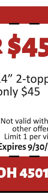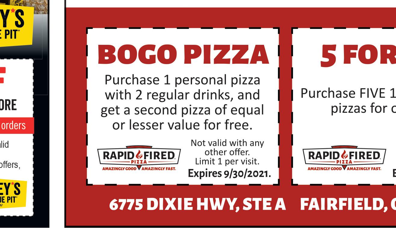 $3.50 Charge for Delivery • Limited Area • Minimum Order $10.00 $999 Fairfield Pizza & Pasta • 513-829-2200 With this coupon only. Only one coupon or offer per household. $3.50 delivery charge. Offer Expires 9/15/21. or 2 Sandwiches with Dinner Fairfield Pizza & Pasta • 513-829-2200 With this coupon only. Only one coupon or offer per household. $3.50 delivery charge. Offer Expires 9/15/21. Fairfield Pizza & Pasta • 513-829-2200 With this coupon only. Only one coupon or offer per household. $3.50 delivery charge. Offer Expires 9/15/21. 16” X-Large 1-Topping Pizza $1449 Fairfield Pizza & Pasta • 513-829-2200 With this coupon only. Only one coupon or offer per household. $3.50 delivery charge. Offer Expires 9/15/21. Fairfield Pizza & Pasta • 513-829-2200 With this coupon only. Only one coupon or offer per household. $3.50 delivery charge. Offer Expires 9/15/21. Fairfield Pizza & Pasta • 513-829-2200 With this coupon only. Only one coupon or offer per household. $3.50 delivery charge. Offer Expires 9/15/21. Gift Cards Available FIND US ON THE TMS APP 829-2200 Family Pasta with Lg Garlic Bread and Family Salad Chargrilled Chicken & Meatballs extra $2599 Fairfield Pizza & Pasta • 513-829-2200 With this coupon only. Only one coupon or offer per household. $3.50 delivery charge. Offer Expires 9/15/21. 2-Topping Pizza, Large Salad and Small Garlic Bread Like us on Like us on ON-LINE ORDERING NOW AVAILABLE! www.fairfi eldpizzaandpasta.com Sunday - Thursday 11am - 9pm, Friday & Saturday 11am - 11pm 2 Large 1-Topping Pizzas $2399 Steak Hoagie $500 POSTAL CUSTOMER PRSRT STD ECRWSS U.S. POSTAGE PAID Town Money Saver, Inc. FIND US ON THE TMS APP FAIRFIELD Published By Town Money Saver, Inc. Corporate Office • PO Box 356 • Lucas, OH 44843 © 2021 TMS Franchising. All rights reserved. For advertising information, call Kelsey 419-343-1734 NEXT ISSUE IN HOMES: September 9, 2021 ADVERTISING DEADLINE: August 25, 2021 townmoneysaver.com
