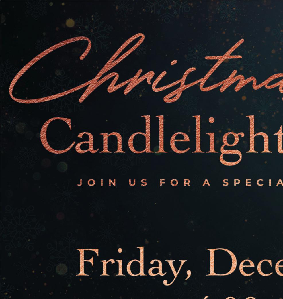 740 Nilles Road, Fairfield, OH 45014 | 513.795.0581 www.thebiancarosesalon.com | thebiancarosesalon@gmail.com BOOK YOUR SERVICE NOW With TMS coupon. Only one o er per visit. Cannot be combined. O er valid with appointments booked with Elena or Jaclyn only. Expires 1/15/22. THE BIANCA ROSE SALON • 513.795.0581 With TMS coupon. Only one o er per visit. Cannot be combined. O er valid with appointments booked with Elena or Jaclyn only. Expires 1/15/22. THE BIANCA ROSE SALON • 513.795.0581 With TMS coupon. Only one o er per visit. Cannot be combined. O er valid with appointments booked with Elena or Jaclyn only. Expires 1/15/22. THE BIANCA ROSE SALON • 513.795.0581 COMPLIMENTARY HAIRCUT with Any Color Service NEW CLIENTS 20% OFF ANY SERVICE COMPLIMENTARY CONDITIONING TREATMENT with Any Color Service e telling of the Christmas story through scripture, music, and media. Tri-County Assembly of God 7350 Dixie Highway, Fairfield OH, 45014 • www.tcalife.com/christmas