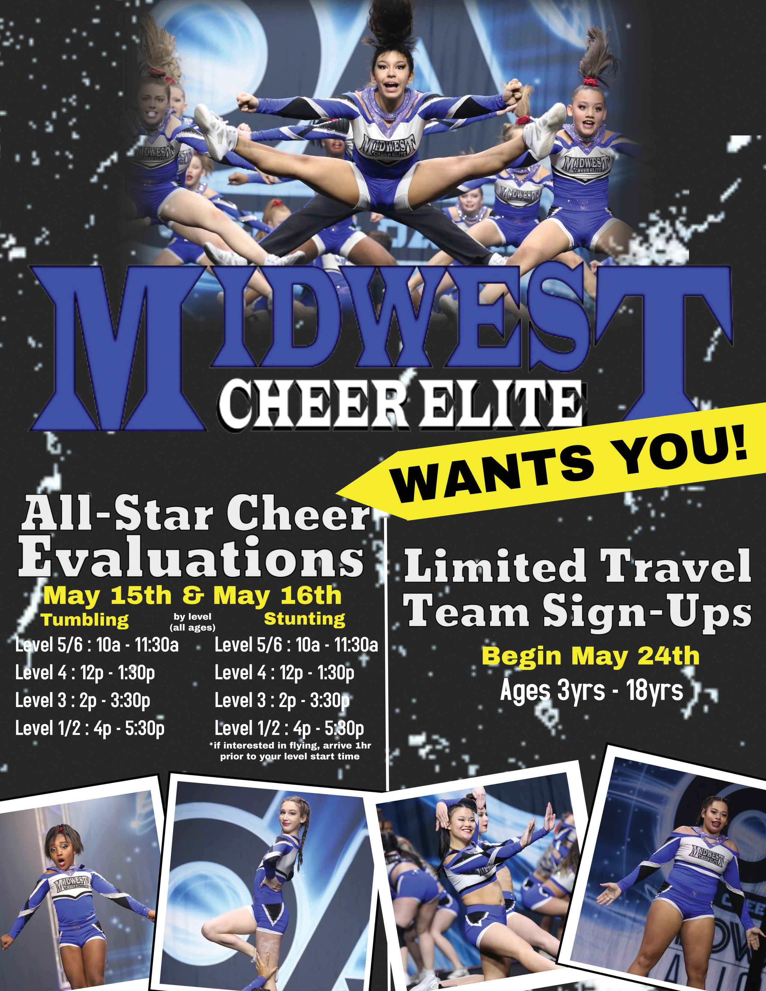 513-779-9111 | www.midwestcheerelite.com • 4985 Provident Drive, West Chester Twp, Ohio 45246 TRYFREEOUTS! TRYFREEOUTS!
