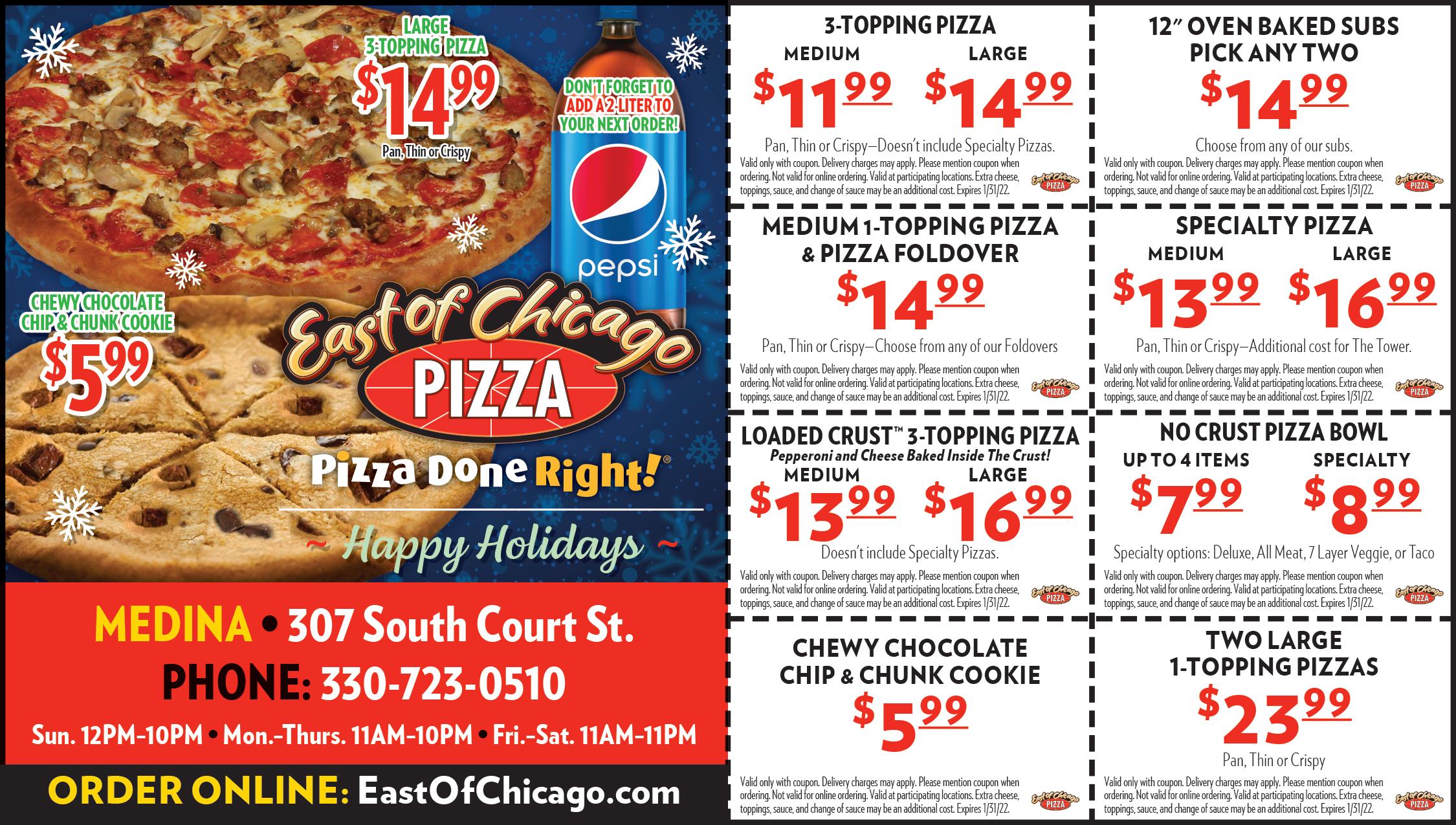 Smoothies, Blended Bowls, Fresh Squeezed Juice, Wheatgrass & Ginger Shots, Wraps, Salads & more! PULPJUICEANDSMOOTHIE.COM Valid at Medina location only. One coupon per customer per visit. Offers cannot be combined. Must present coupon at time of purchase. Expires 1-31-2022 Valid at Medina location only. One coupon per customer per visit. Offers cannot be combined. Must present coupon at time of purchase. Expires 1-31-2022 Valid at Medina location only. One coupon per customer per visit. Offers cannot be combined. Must present coupon at time of purchase. Expires 1-31-2022 NOW HIRING PULP GIFT CARDS make great stocking stuffers. They’re also great for gift exchanges, co-workers or any Pulp fan! Available in any denomination. CHINESE FOOD CARRY OUT Center Pointe Plaza • 1164 North Court St. Tel: (330) 764-3332 • (330) 764-3336 www.AsianGrillChinese.com CLOSED ON MONDAYS Hours: Mon. - Thurs: 11am-9pm Fri. & Sat. 11am-9:30pm Sun. 11am-10pm Free Coupon & Menu on Website WE ACCEPT OTHER CHINESE RESTAURANTS COUPONS IN MEDINA! FREE 1 EGG ROLL OR 1 CAN OF SODA WITH ORDER OVER $10 VALID FOR PICK UP ONLY CANNOT BE COMBINED WITH ANY OTHER OFFERS. ONE COUPON PER PERSON. EXP 1/20/22. FREE SMALL PORK OR CHICKEN FRIED RICE WITH ORDER OVER $30 VALID FOR PICK UP ONLY CANNOT BE COMBINED WITH ANY OTHER OFFERS. ONE COUPON PER PERSON. EXP 1/20/22. FREE 2 EGG ROLLS OR 10% OFF WITH ORDER OVER $15 VALID FOR PICK UP ONLY CANNOT BE COMBINED WITH ANY OTHER OFFERS. ONE COUPON PER PERSON. EXP 1/20/22. FREE GENERAL TSO’S OR SWEET & SOUR CHICKEN WITH ORDER OVER $40 VALID FOR PICK UP ONLY CANNOT BE COMBINED WITH ANY OTHER OFFERS. ONE COUPON PER PERSON. EXP 1/20/22. FREE CHEESE WONTON WITH ORDER OVER $25 VALID FOR PICK UP ONLY CANNOT BE COMBINED WITH ANY OTHER OFFERS. ONE COUPON PER PERSON. EXP 1/20/22. $3 OFF ANY PURCHASE OF $20 OR MORE VALID FOR PICK UP ONLY CANNOT BE COMBINED WITH ANY OTHER OFFERS. ONE COUPON PER PERSON. EXP 1/20/22. WE NOW DELIVER THROUGH qMenu, Menufy, or doordash!