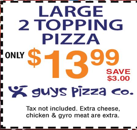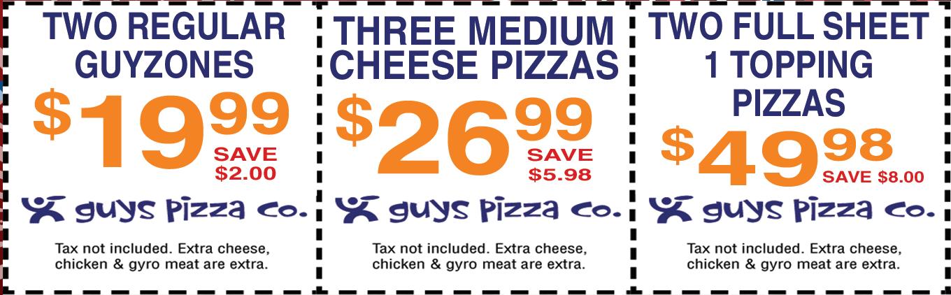 available in 12” only. Add $3.50 Note: Gluten Free Crust is prepared in a common kitchen with the risk of gluten exposure. Therefore, Guys Pizza Co. DOES for customers with Celiac disease. Customers with gluten sensitivities should exercise judgment in consuming this pizza. Small Medium Large Big Guy 1/2 Sheet Full Sheet 12.99 17.99 19.99 27.99 25.99 37.99 7.99 10.99 15.99 28.99 50¢ - 1.00 each