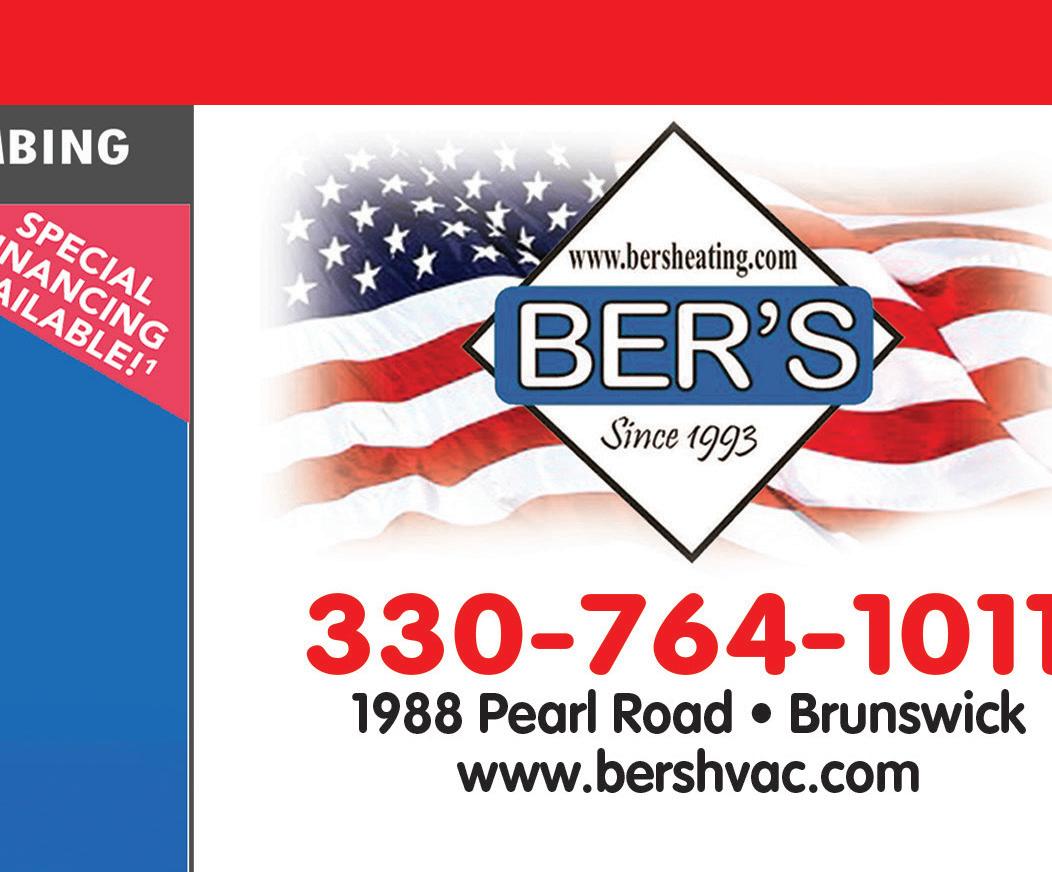 KEEP YOUR FAMILY COMFY AND COOL THIS SUMMER! A/C Clean & Tune-Up just $94 BER’S • 330-764-1011 With this coupon. Not valid with other offers or prior service. Expires 8-11-22. TMS BER’S • 330-764-1011 With this coupon. Not valid with other offers or prior service. Expires 8-11-22. TMS BER’S • 330-764-1011 With this coupon. Not valid with other offers or prior service. Expires 8-11-22. TMS BER’S • 330-764-1011 With this coupon. Not valid with other offers or prior service. Expires 8-11-22. TMS $25 OFF excludes commerical work All Plumbing & Electrical Work SAVE UP TO $500 OFF Any American Standard Air Conditioner or Furnace Unit BASIC ANNUAL SERVICE PLANS starting at $198/yr Subject to credit approval, see store for details. *See your participating independent American Standard Dealer for complete program eligibility, dates, details and restrictions. Instant rebate up to $600. All sales must be to homeowners in the United States. Void where prohibited. Valid on Qualifying Equipment only. Offer expires 08/11/2022. SAVE $20 OFF SAVE $15.00 DIAGNOSTIC TESTING Must present coupon prior to service. Cannot be combined with any other offer or coupon. Expires 8/15/22 Must present coupon prior to service. Cannot be combined with any other offer or coupon. Expires 8/15/22 Must present coupon prior to service. Cannot be combined with any other offer or coupon. Expires 8/15/22 Must present coupon prior to service. Cannot be combined with any other offer or coupon. Expires 8/15/22 2022 SERVICE SPECIAL $10 OFF $100 or More $20 OFF $200 or More $30 OFF $300 or More SAVE UP TO $20 on ANY BRAKE SERVICE ($10 per Axle) ON ANY AIR CONDITIONING SERVICE SAVE $5 OFF Must present coupon prior to service. Cannot be combined with any other offer or coupon. Expires 8/15/22 ANY OIL CHANGE SERVICE