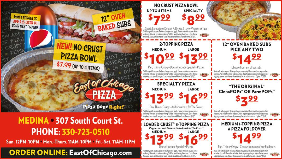 MEDINA June 2021 Shop locally. Save locally. A/C or Furnace Clean & Check $7900 Must present coupon at time of service. Not valid with any other offers. With coupon only. Expires 7-30-21 330-723-0001 Must present coupon at time of service. Not valid with any other offers. With coupon only. Expires 7-30-21 Any Air Conditioning or Furnace Installation $5000 OFF 330-723-0001 Trane Dealer for 30 years Ask for Dave Dufala. 330-723-0001 3374 Pearl Rd. (North of Fenn Rd.) LOWER YOUR GAS BILLS! Follow us on facebook for specials and updates! @ohiovalleypizza