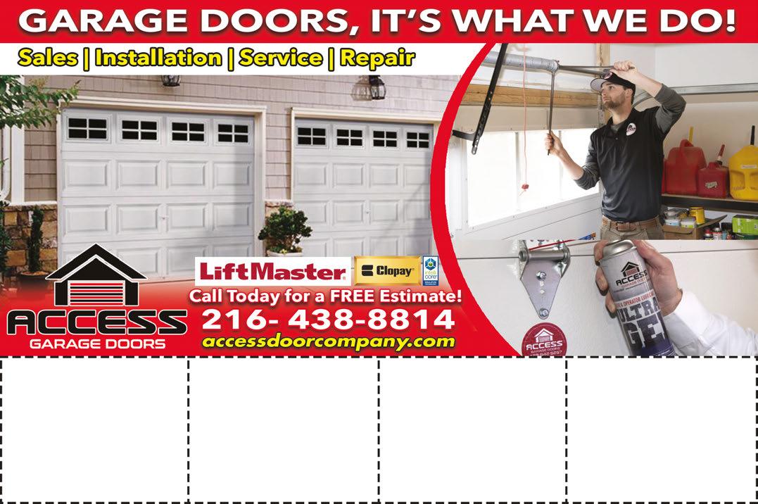 FULLY INSURED & WORK GUARANTEED! SENIOR DISCOUNT 10% • MILITARY DISCOUNT 15% • Tree Removal • Trimming • Deadwood • Turf Friendly Equipment • Backyard Portable Lift • Fit through 36” Gate Fast Reliable Service! Family Owned Since 1992 MAJOR CREDIT CARDS ACCEPTED GARAGE DOORS • OPENERS • REPAIRS Commercial & Residential Since 1986 Visit Our NEW SHOWROOM AT 100 Pelret Industrial Pkwy. Unit C. in Berea We’re Still Here After 30 Years! Even Through Economic Hardship 440-572-0347 www.bboverheaddoor.com • bobsandersdoor@gmail.com 24Hour Emergency Service B&B Overhead Door 440-572-0347 With TMS coupon only. Not valid with other offers. Expires 7/15/21 B&B Overhead Door 440-572-0347 With TMS coupon only. Not valid with other offers. Expires 7/15/21 B&B Overhead Door 440-572-0347 With TMS coupon only. Not valid with other offers. Expires 7/15/21 B&B Overhead Door 440-572-0347 With TMS coupon only. Not valid with other offers. Expires 7/15/21 $1495 New CHI Garage Door Installed 16’x7’Model2283 PLUSLiftMaster OpenerModel8365 LiftMaster Opener Installed 1/2HPModel8365 w/2Remotes& Keypad $34500 REPAIRS Broken Springs? 2SpringsRepaired $19500 GENERAL SERVICE CALL RestrictionsApply $3995