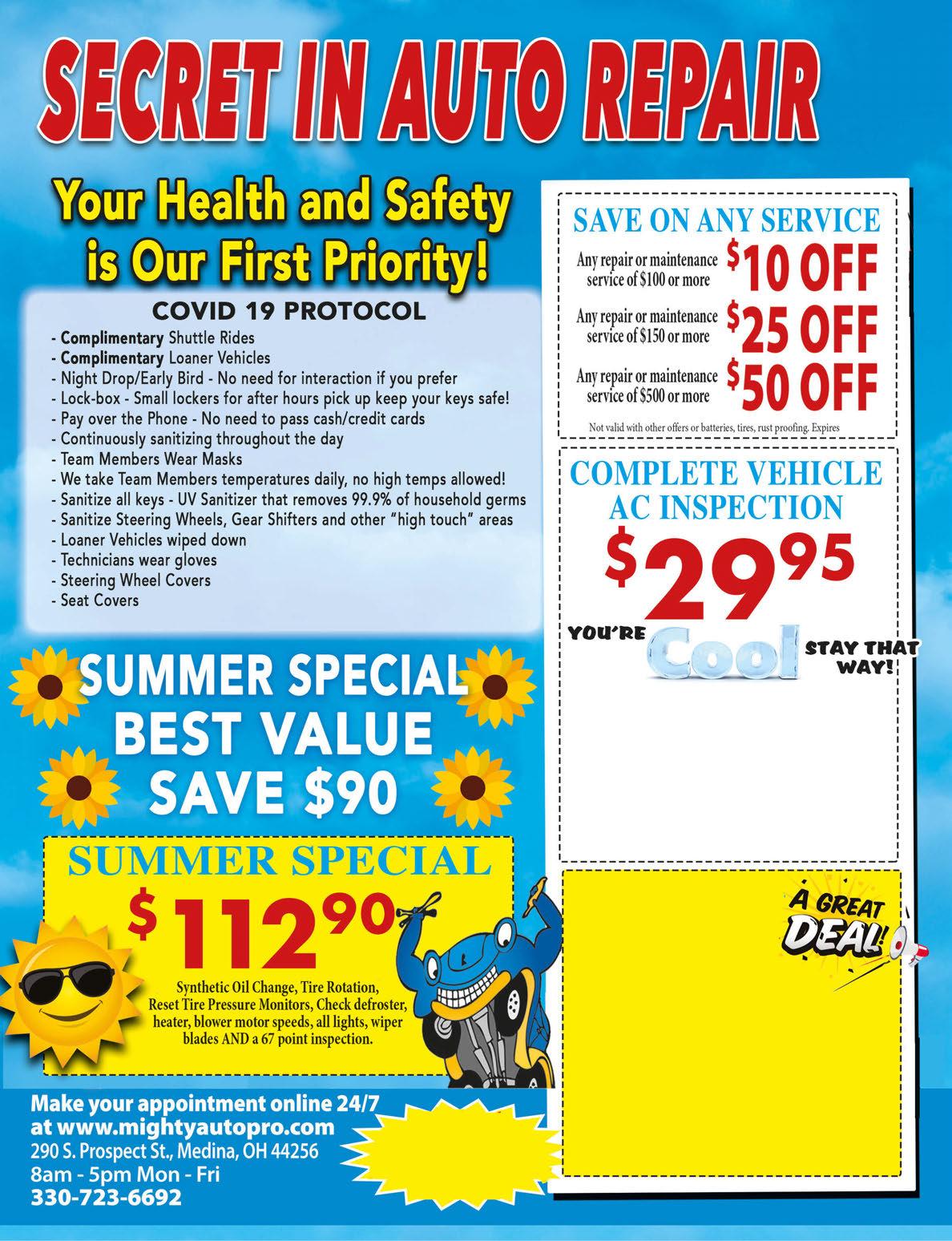 BUY 1 COMBINATION PLATTER #1-32 ONLY ANDGET 2ND COMBO 1/2 OFF #1-32 ONLY (1) coupon per table. Not to be combined w/any other offers. BUY 1 LUNCH ANDGET 2ND LUNCH 1/2 OFF Mon-Fri 11am-2:30pm (Fajitas not included) (1) coupon per table. Not to be combined w/any other offers. ANY PURCHASE OVER $20 (1) coupon per table. Not to be combined w/any other offers. ANY PURCHASE OVER $35 (1) coupon per table. Not to be combined w/any other offers. ANY PURCHASE OVER $50 (1) coupon per table. Not to be combined w/any other offers. ANY PURCHASE OVER $100 (1) coupon per table. Not to be combined w/any other offers. STATE RT 18 AI ROOT CAR CARE SPECIAL Oil Change, Tire Rotation, All Fluids topped off, Brake Inspection, Battery Check, Belts & Hoses Check Up to 5 qrts major brand oil, filter, and lube where applicable. Expires 8/15/2021 $34.95 Additional Brands Available AC CHECK MOST VEHICLES Refrigerant Additional Cost. Expires 8/15/2021 $39.99